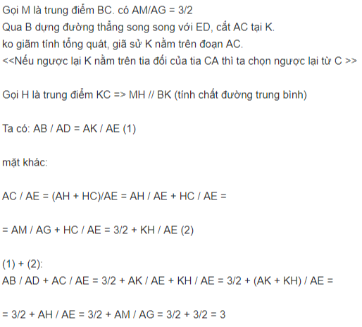 tam giác abc đường thẳng đi qua trọng tâm g cắt ab ac tại de chứng minh ab/ac + ac/ae 3