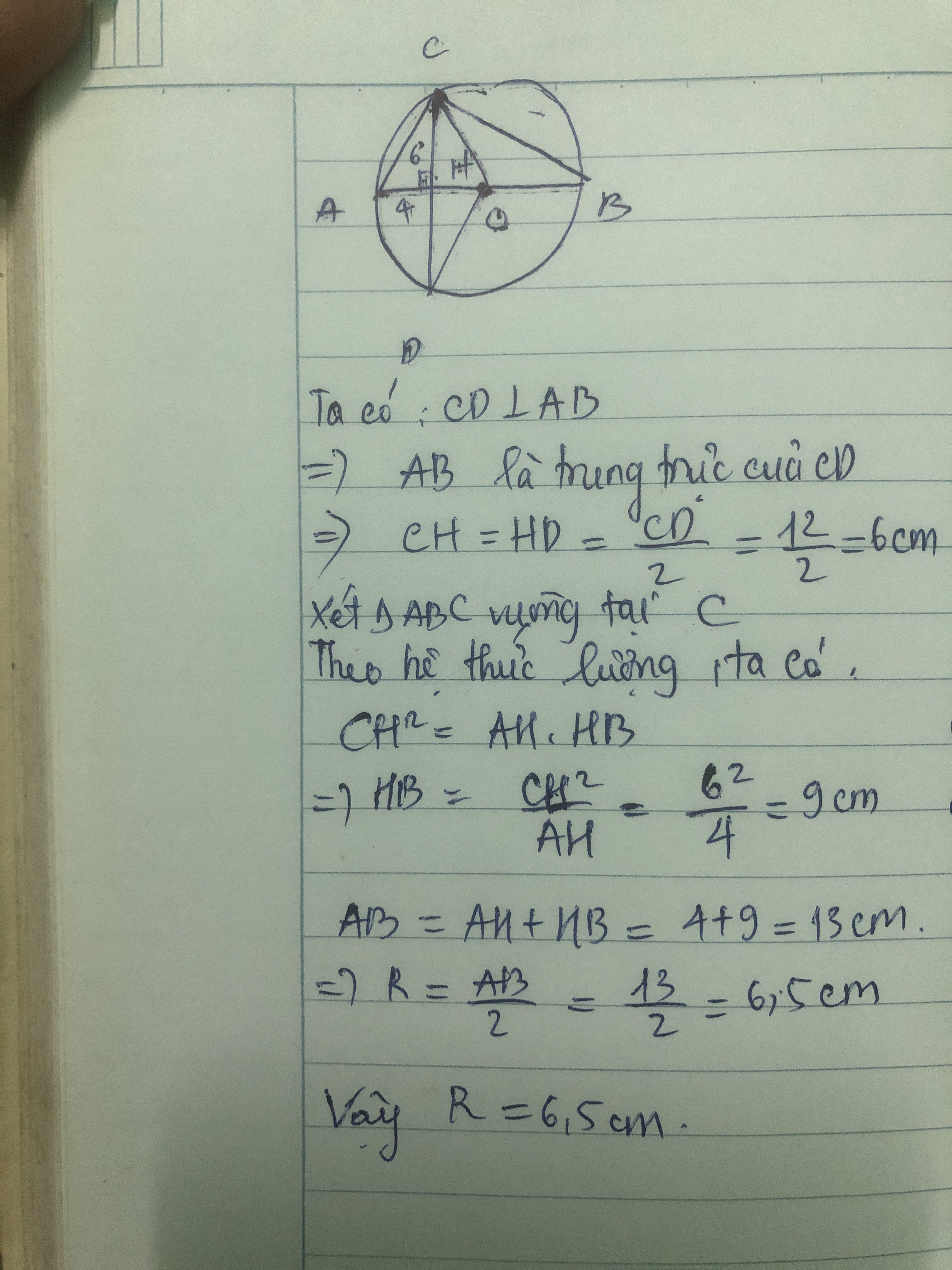 Cho đường tròn (O; R) đường kính AB. Dây CD L AB tại H. Biết rằng CD=12 cm, AH = 4 cm. Tính bán kính của (O;R).
