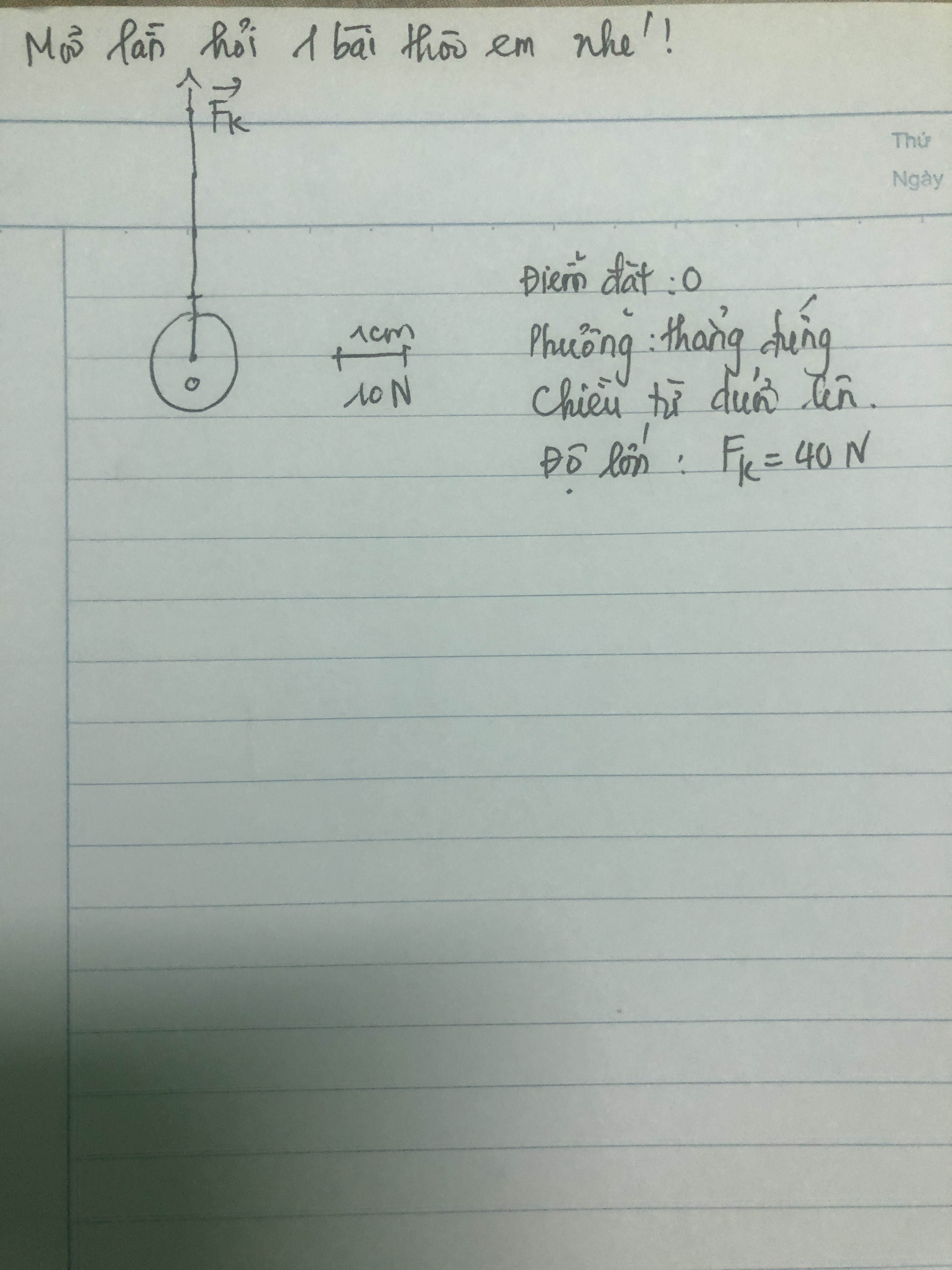 Câu 1: Dùng 1 lực 40N để kéo 1 vật lên trên.Hãy biểu diễn lực kéo đó, nêu rõ điểm đặt, phương chiều và độ lớn, tỉ lệ 1cm=10N