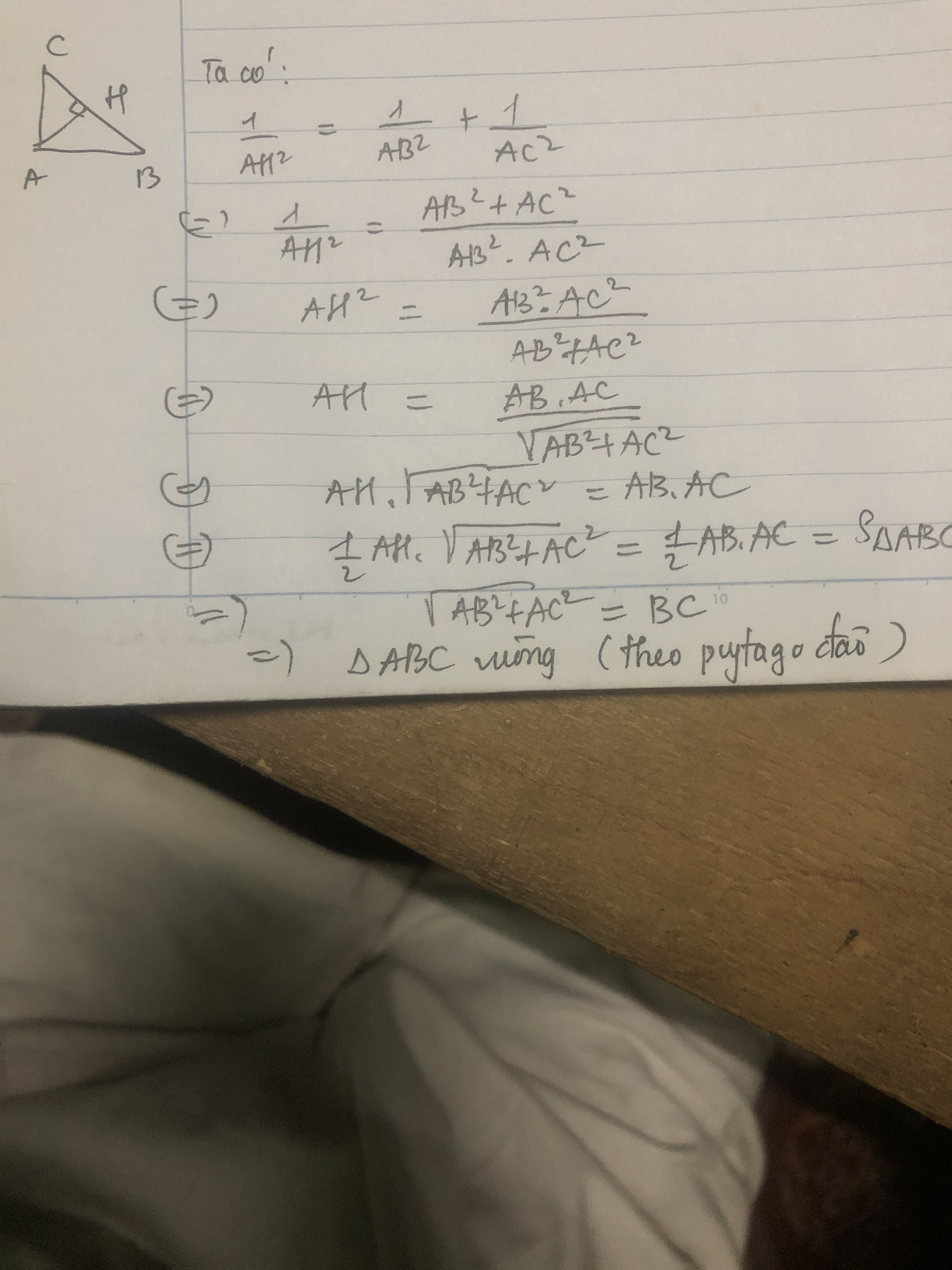 Cho tam giác ABC, đường cao AH. Nếu 1/AH^2=1/AB^2+1/AC^2 thì tan giác ABC vuông, đúng hay sai, giải thích