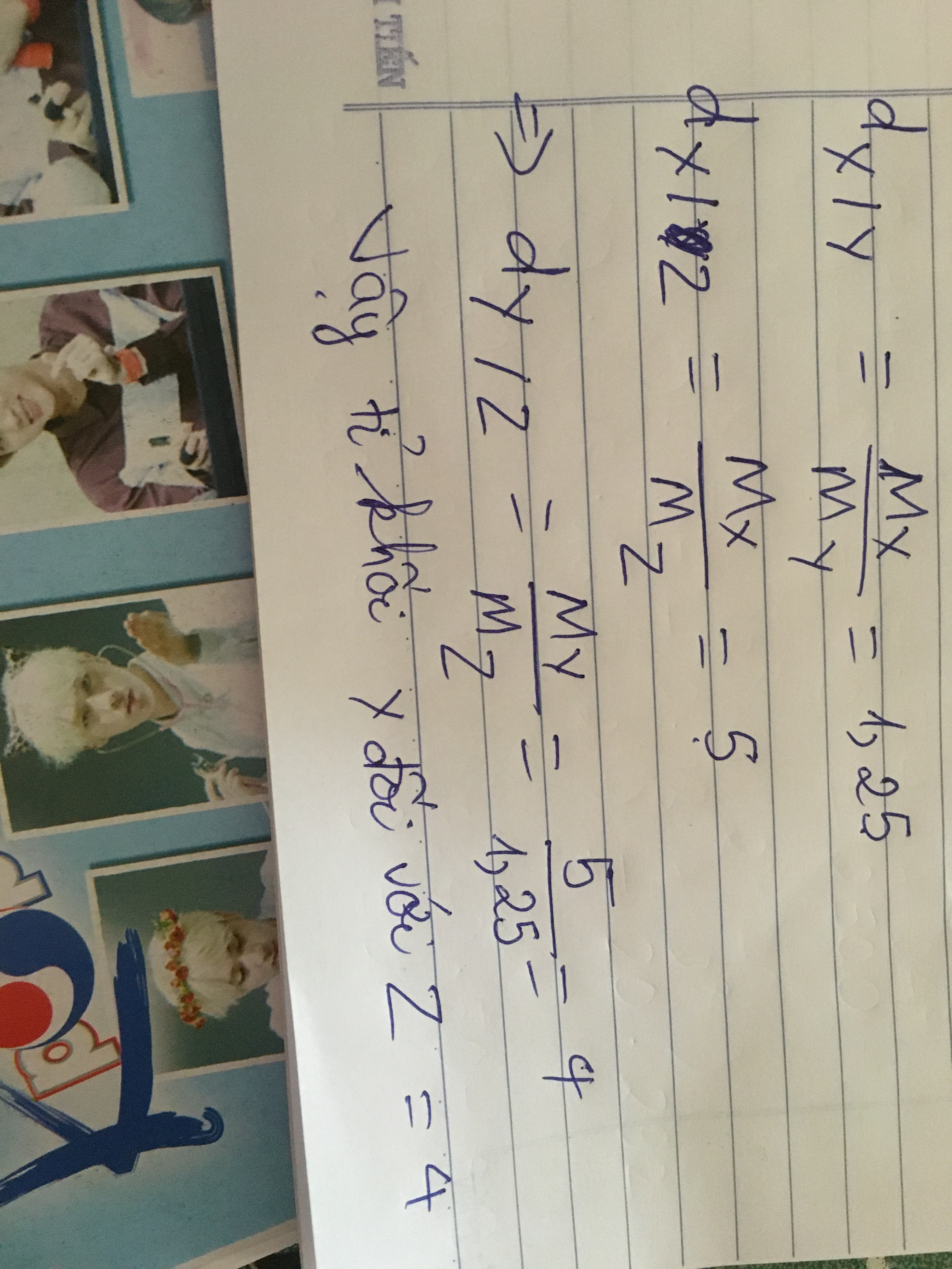 Câu 24. Tỉ khối của khí X đối với khí Y bằng 1,25. Tỉ khối của khí X đối với khí Z bằng 5. Khi đó tỉ