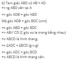 → Hai tam giác ABDABDABD và CBDCBDCBD cân tại A và C, lại có các cạnh liên quan bằng nhau.