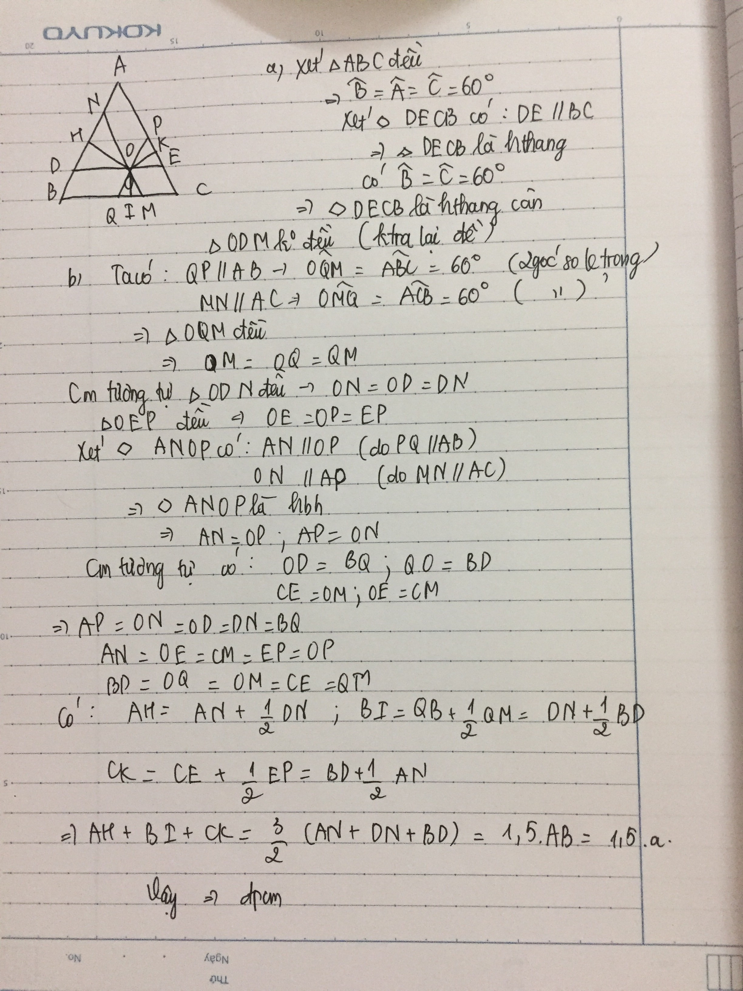 Cho điểm O nằm trong tam giác đều ABC cạnh a. Qua O vẻ các đường thẳng DE//BC (D thuộc AB; E thuộc AC); MN//AC (M thuộc BC; N thuộc AB); PQ//AB (P thuộc AC; Q thuộc BC)