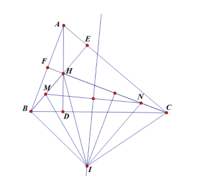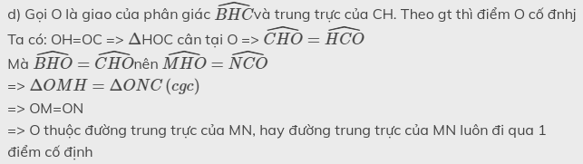 d) trên các đoạn HB,HC lấy điểm M,N tủy ha sao cho HM=CN .Chứng minh:đường trung trực của đoạn MN luôn đi qua 1 điểm cố định