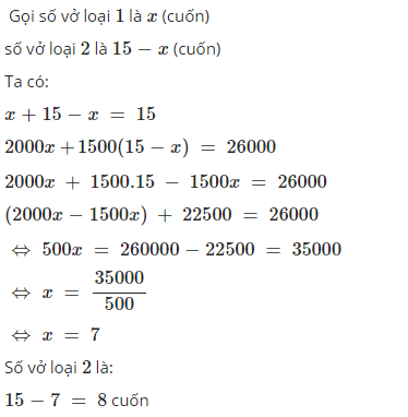 Có 15 quyển vở gồm hai loại : loại I giá 2000 đồng một quyển , loại II giá 1500 đồng một quyển . Số tiền mua 15 quyển vở là 26000 đồng . Hỏi có mấy quyển vở mỗi loại ?