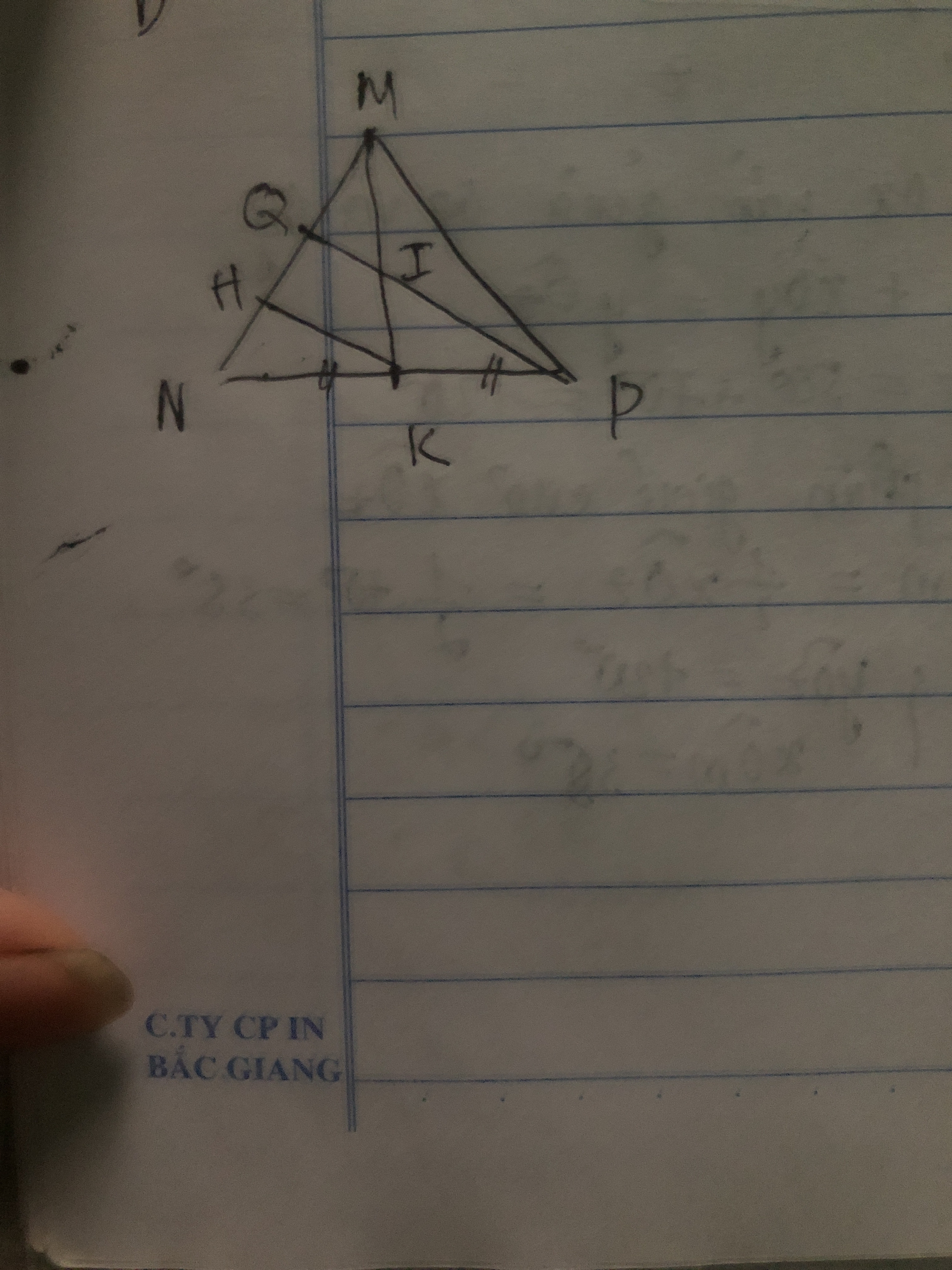 Cho tam giác MNP, K là trung điểm NP, Q là một điểm nằm trên cạnh MN sao cho NQ = 2QM. Gọi I là giao điểm của P Q và MK. Chứng minh I là trung điểm của MK.