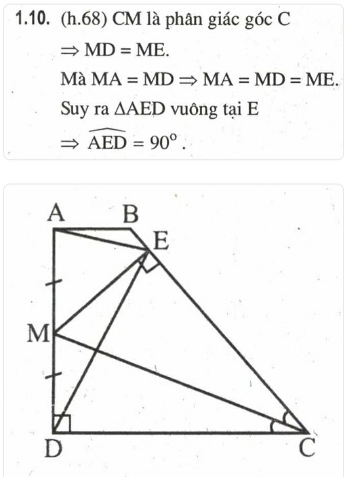 Cho hình thang có góc A = góc D =90 độ , tia phân giác góc C đi qua trung điểm M của AD .Gọi E là hình chiếu của M trên BC . Tính số đo góc AED