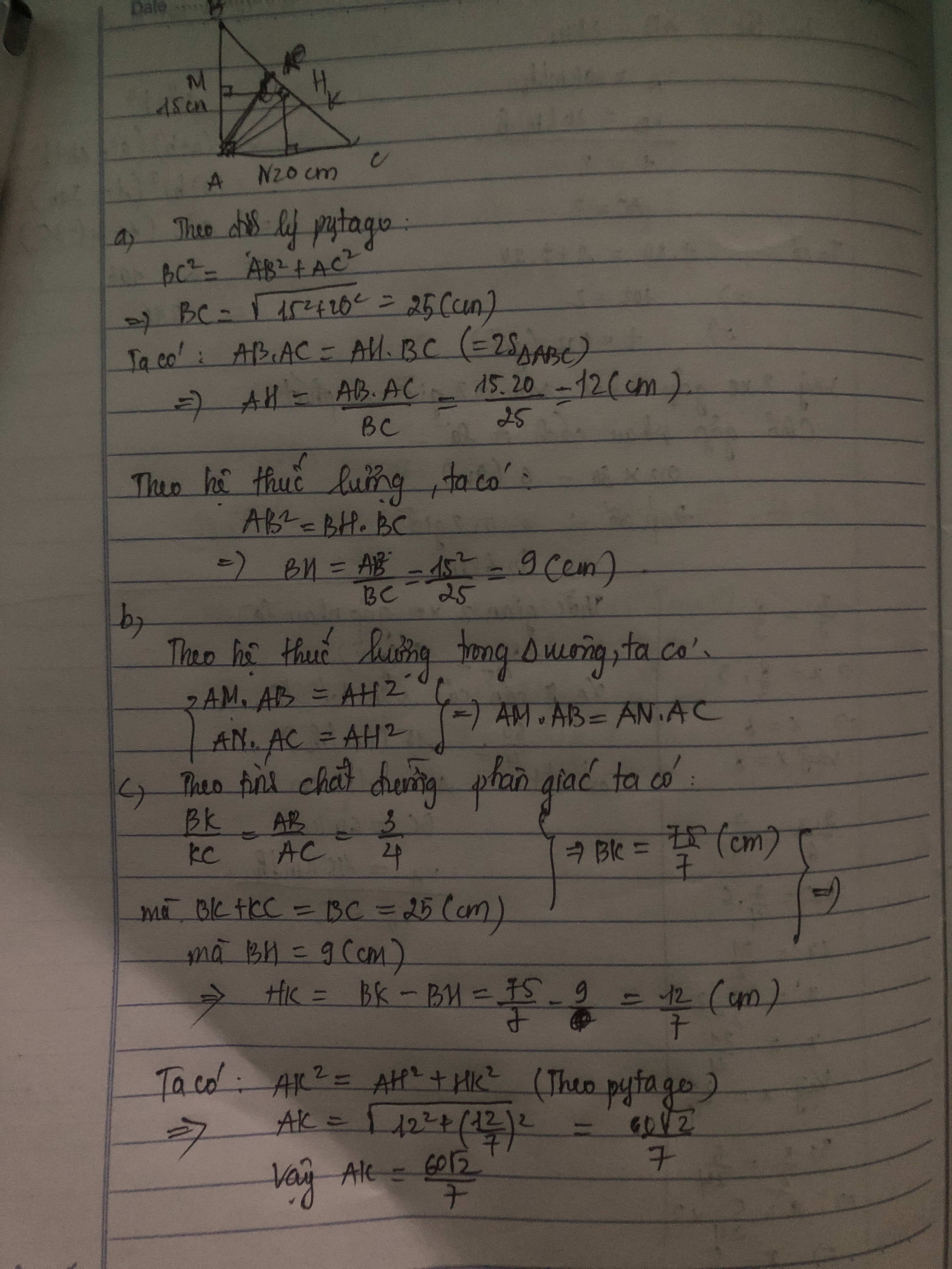 Bài 15:Cho AABC vuông tại A, đường cao AH. Biết AB = 15cm, AC = 20cm.
