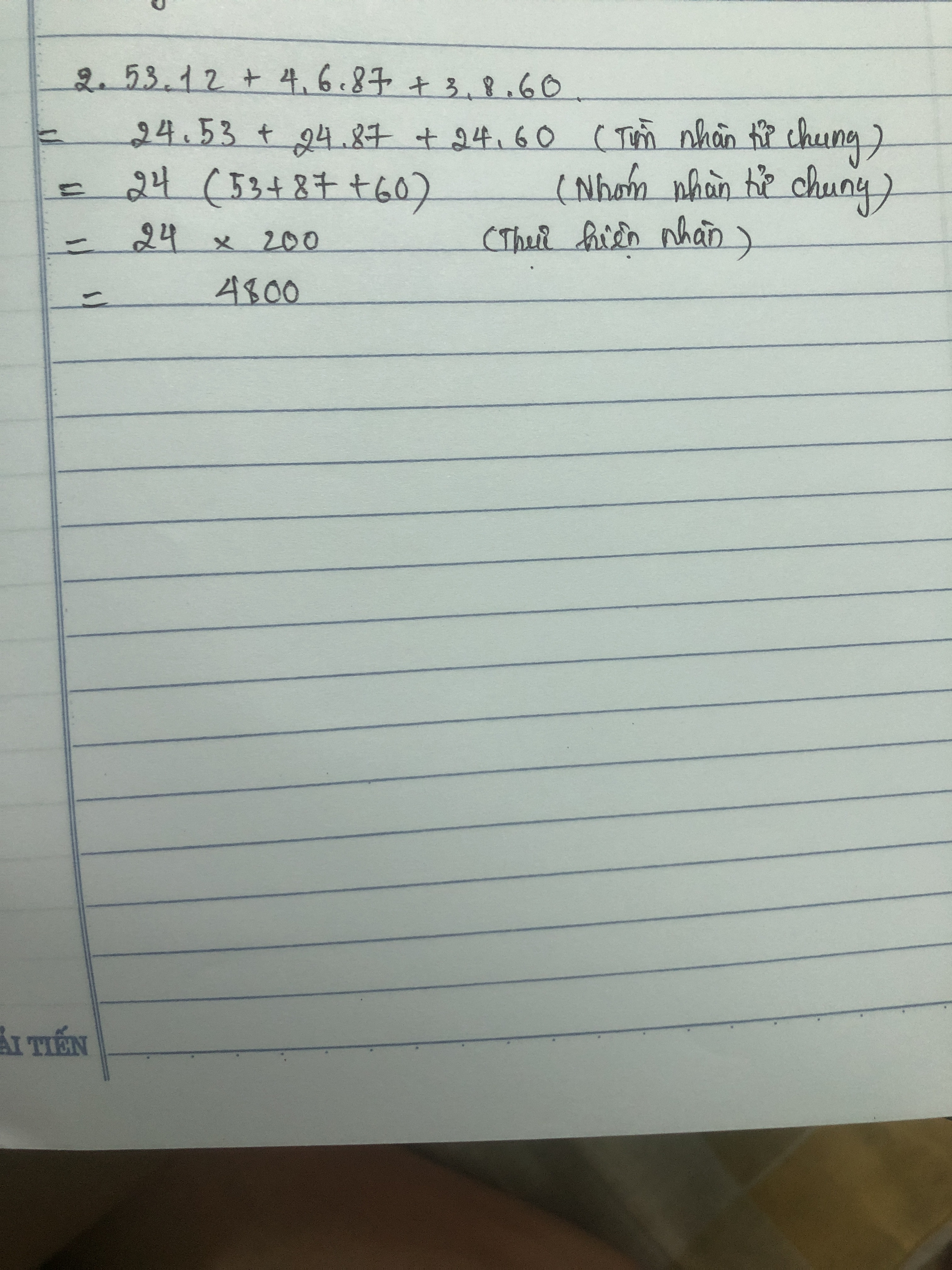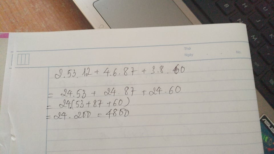 Thực hiện phép tính bằng cách hợp lí nhất 2.53.12 + 4.6.87 + 3.8.60 (Yêu cầu ghi rõ các bước thực hiện)