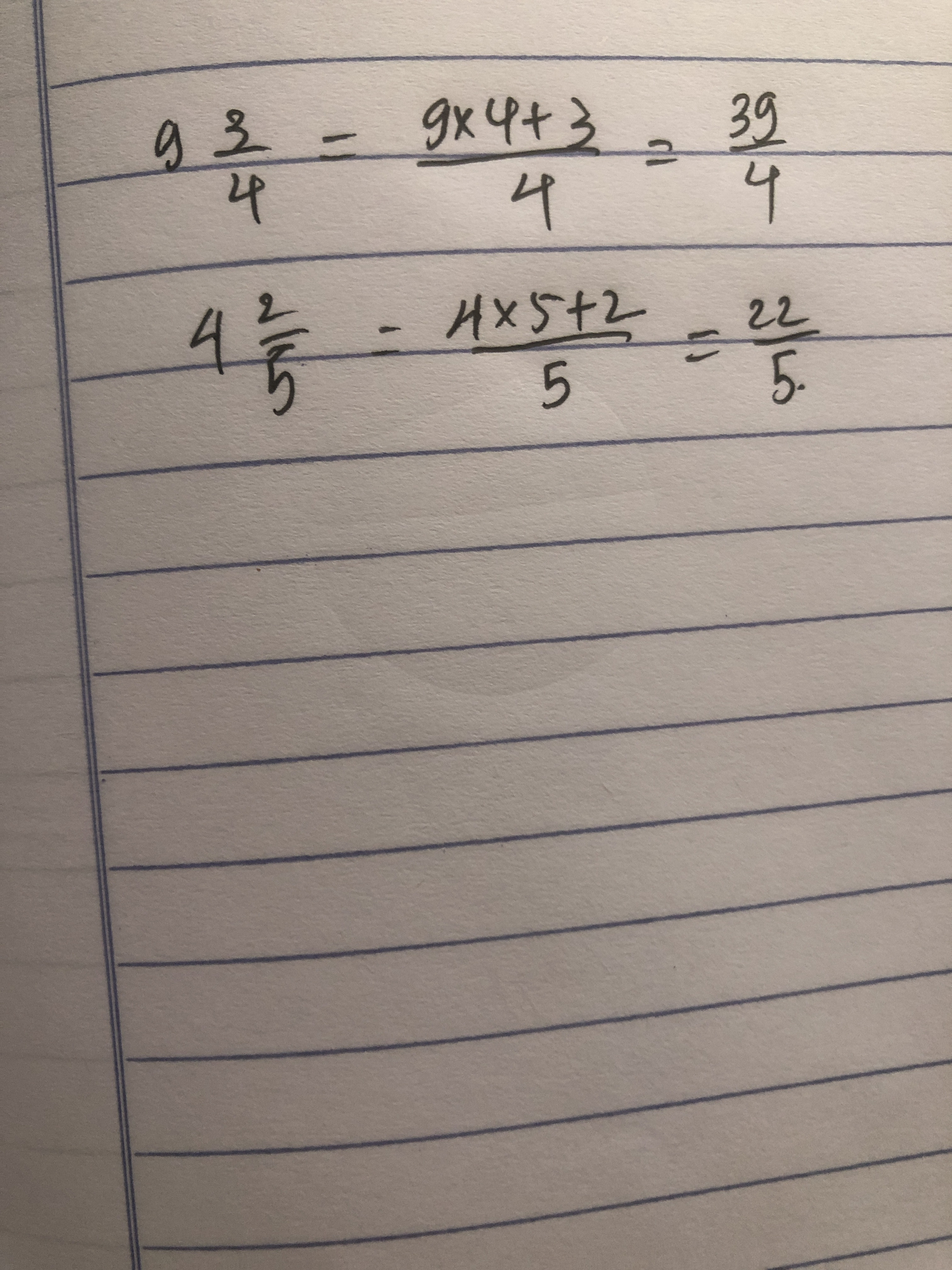 Chuyển về phân số: 9 3/4=, 4 2/5