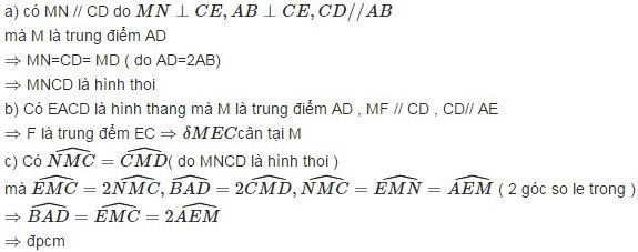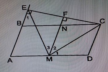 Cho hình bình hành ABCD có AD = 2AB. Từ C vẽ CE vuông góc với AB. Nối E với trung điểm M của AD. Từ M vẽ MF vuông góc với CE cắt BC tại N.
