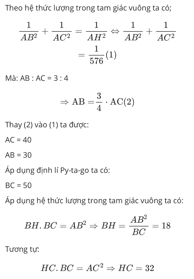 Bài 2: Cho tam giác ABC vuông tại A, AH=24cm. Biết AB:AC=3:4. Tính BH,CH