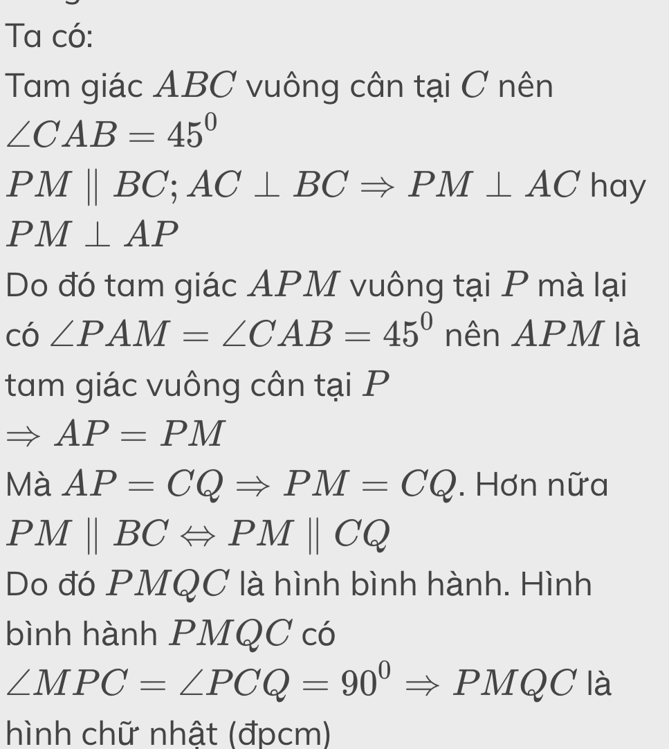 Tam giác APM vuông tại P mà góc PAM=góc CAB= 45 độ nên tam giác AMP là tam iacs vuông cân tại P