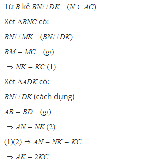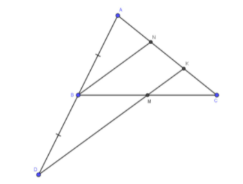 Cho tam giác ABC,điểm D thuộc tia đối của BA sao cho BD=BA.Điểm M là trung điểm của BC.Gọi K là giao điểm của DM và AC.Chứng minh AK=2KC