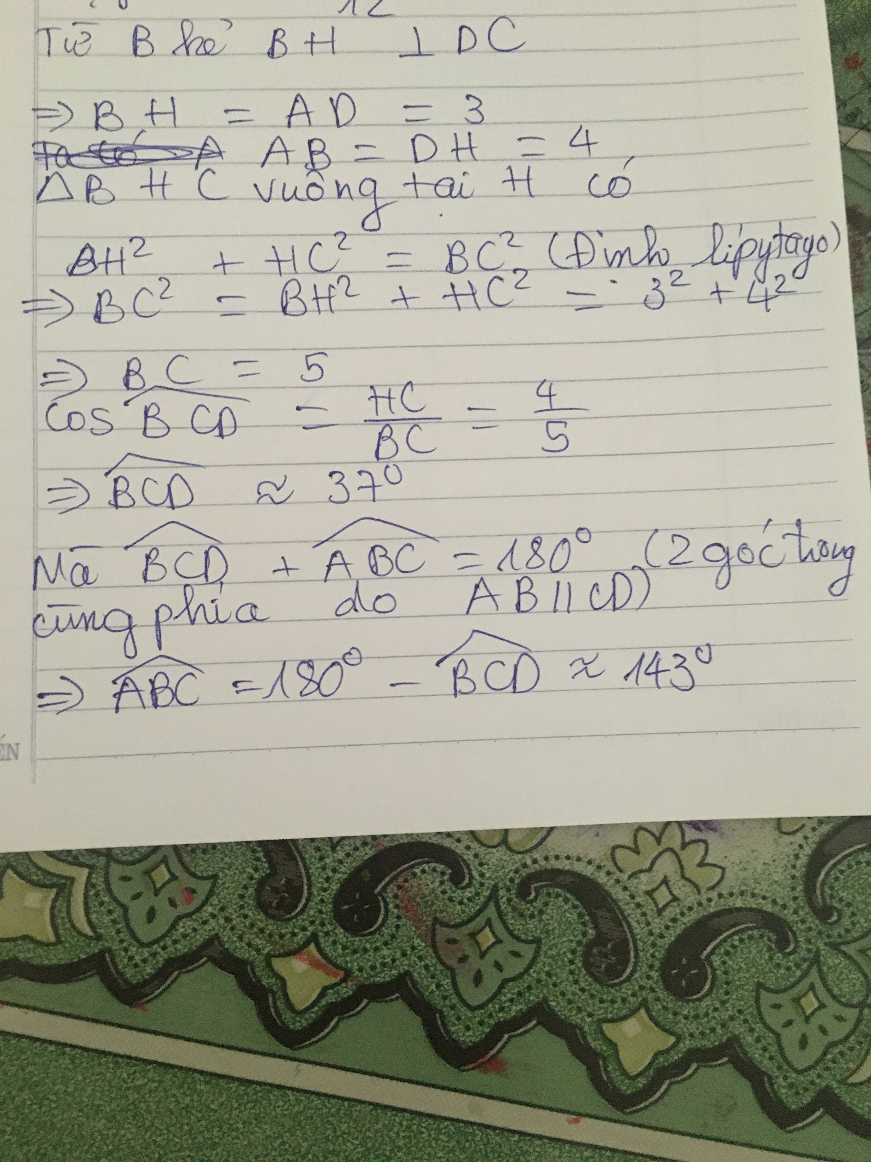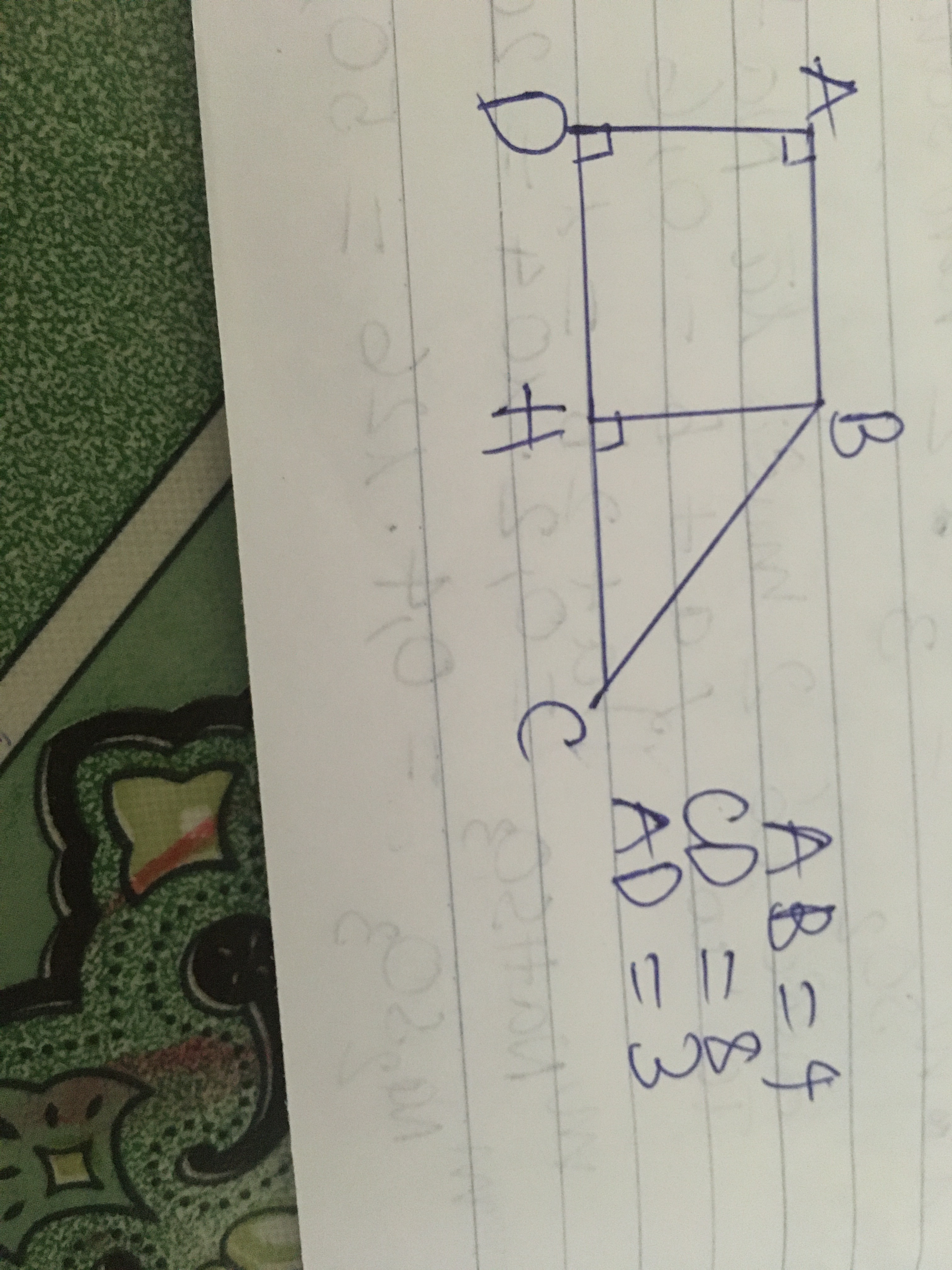 Cho hình thang ABCD có góc A bằng góc D bằng 90 độ đáy nhỏ AB = 4 đáy lớn CD = 8 AD = 3 tính BC và góc B và góc C