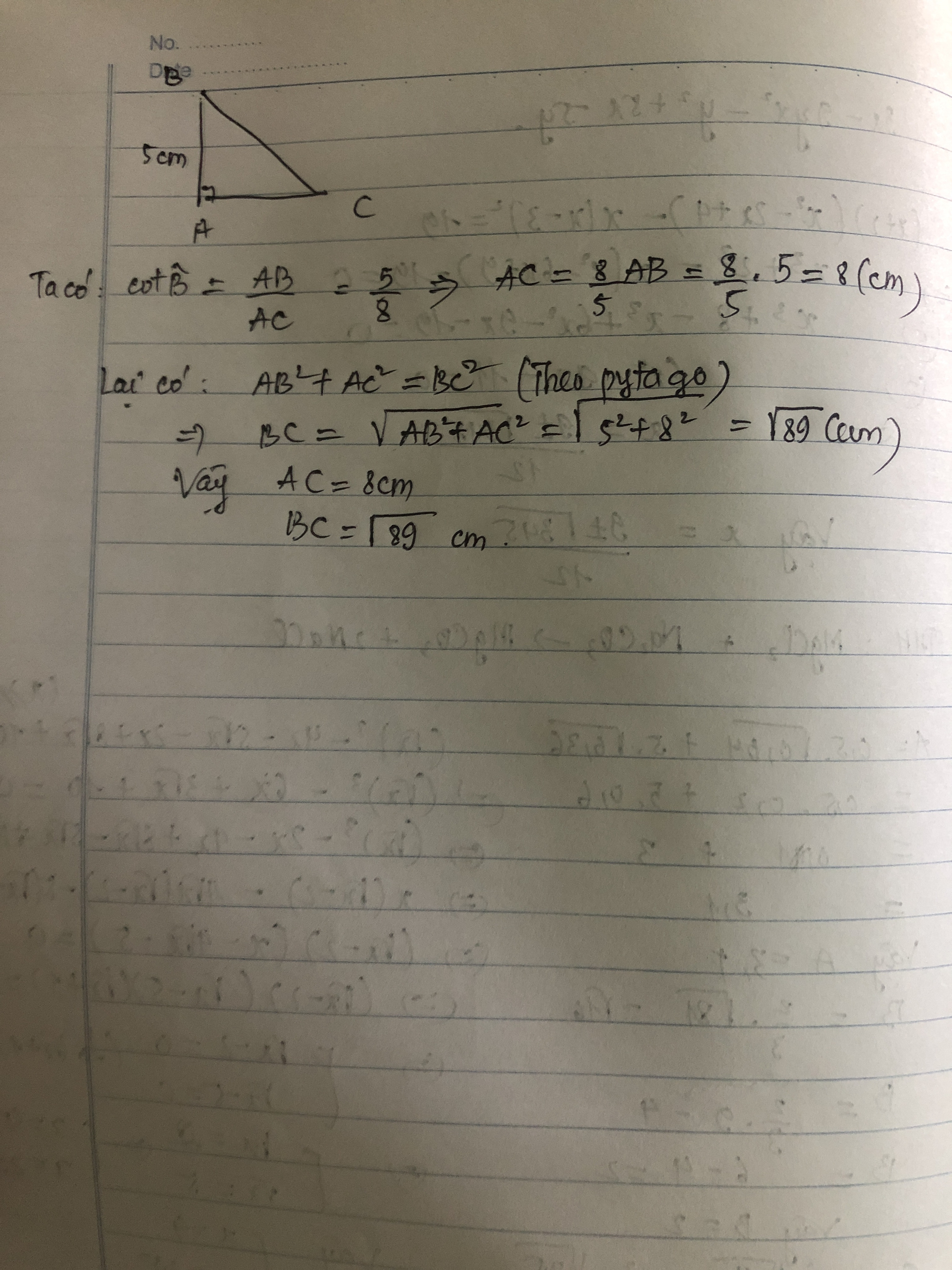 Cho ABC; =; AB=5cm; cotB=. Tính AC; BC