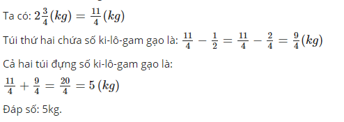 Thôi thứ nhất chứa 2 và 3/4 kg gạo túi thứ hai chứa ít hơn túi thứ nhất 1/2 kg gạo hỏi cả hai túi chứa bao nhiêu kilôgam gạo