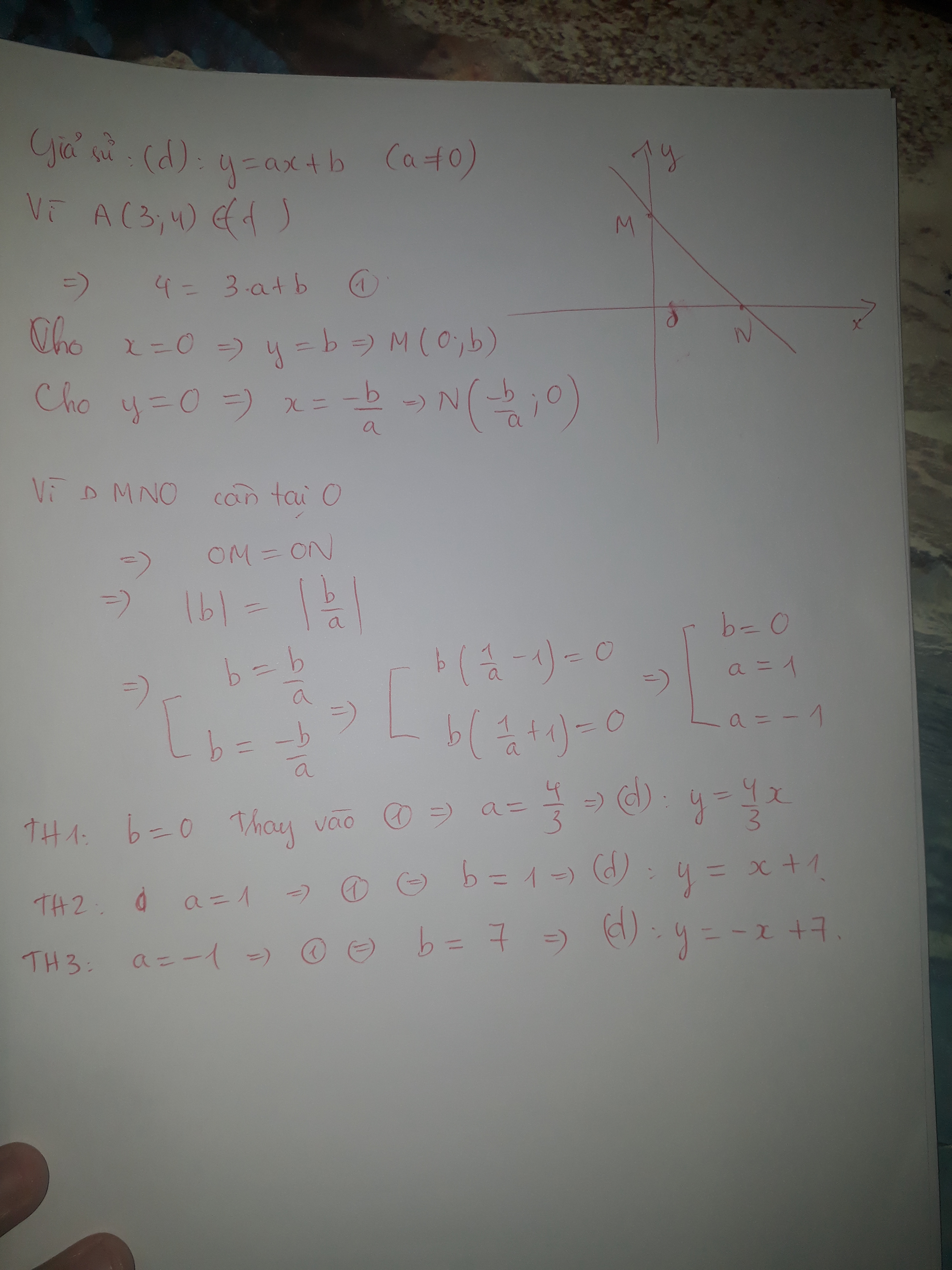 viết phương trình đường thẳng (d) đi qua điểm A(3,4)và tạo với hai trục tọa độ một tam giác cân