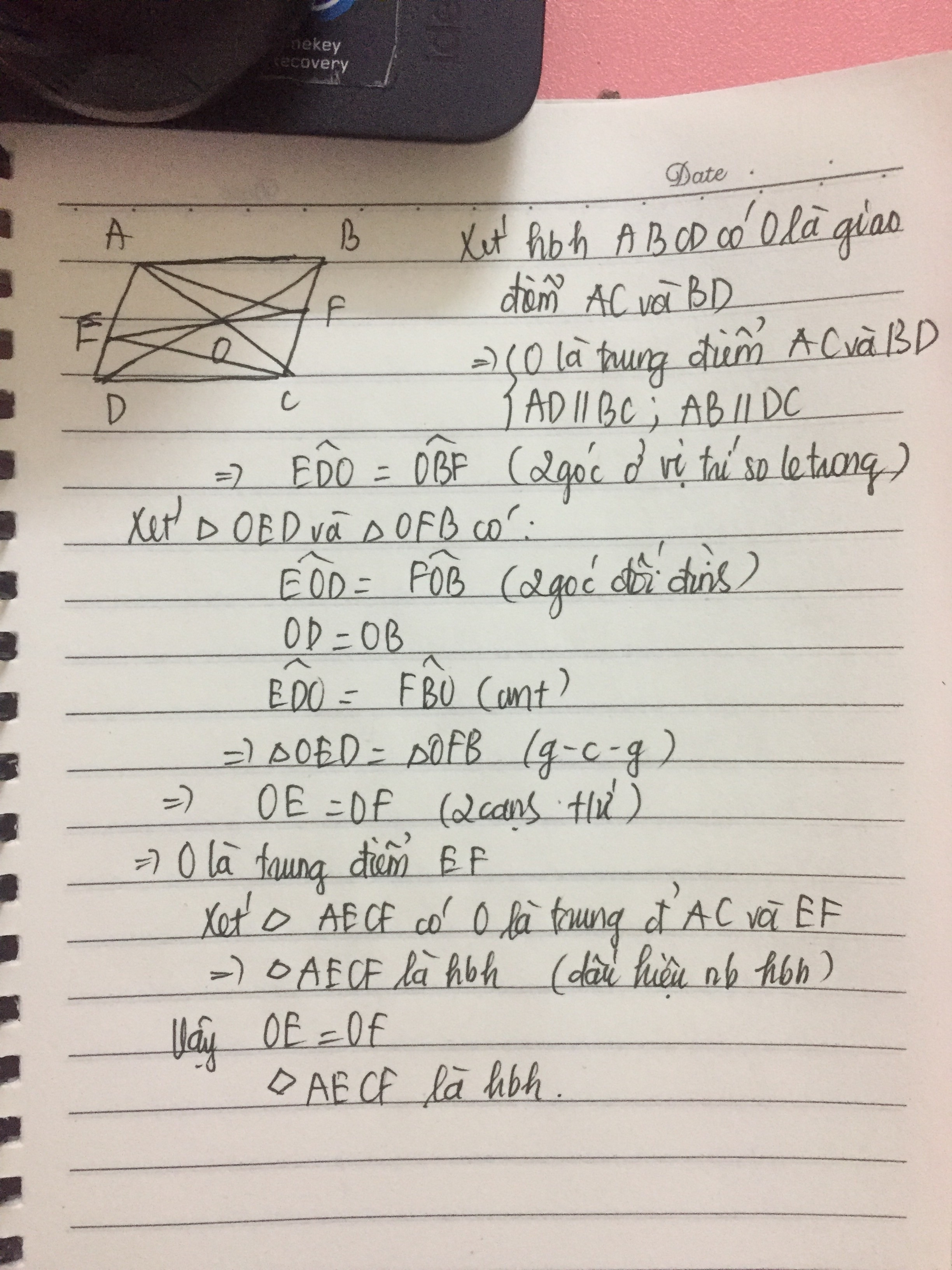 cho hình bình hành ABCD.Gọi O giao điểm 2 đường chéo, 1 đường thẳng qua O cắt AD,BC tại E,F. Cm:OE=OF, AECF là hình bình hành