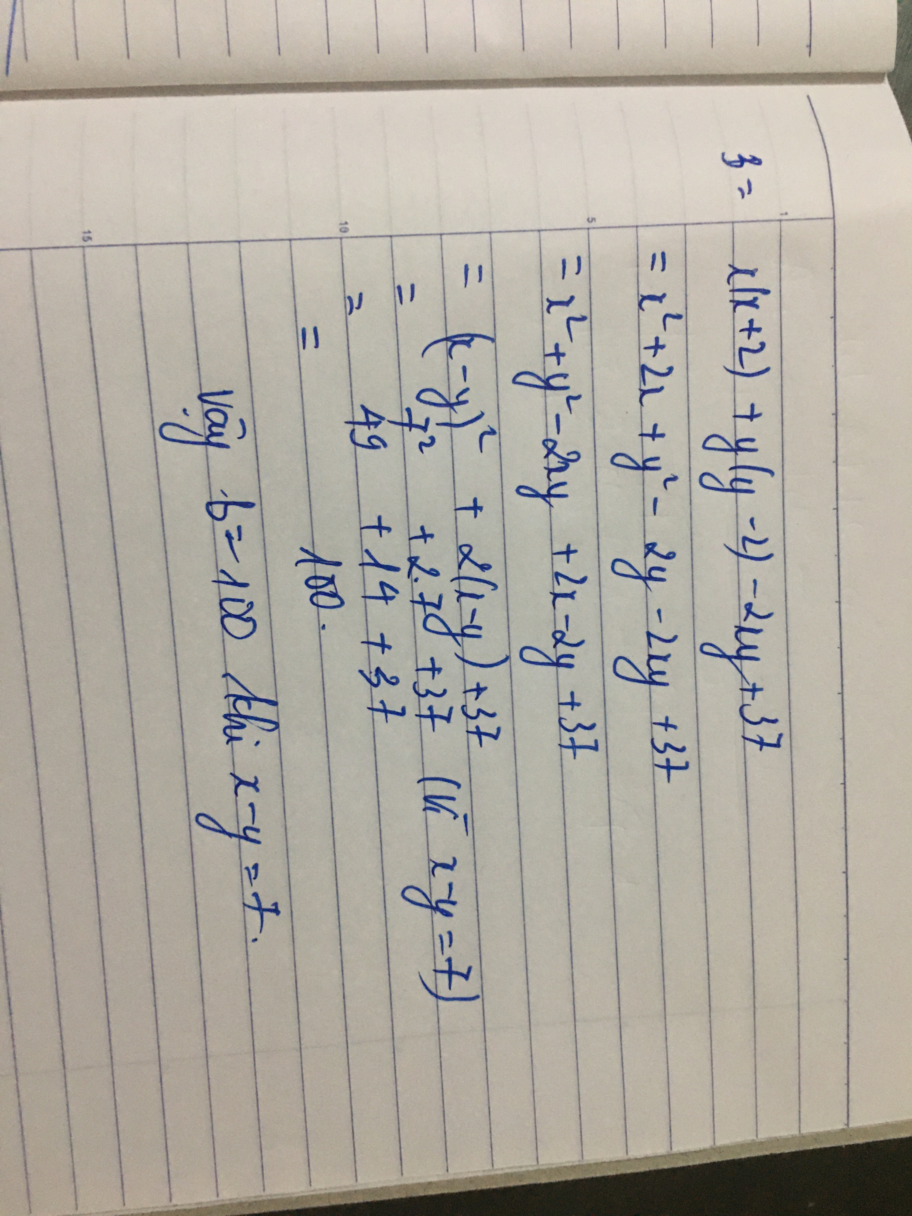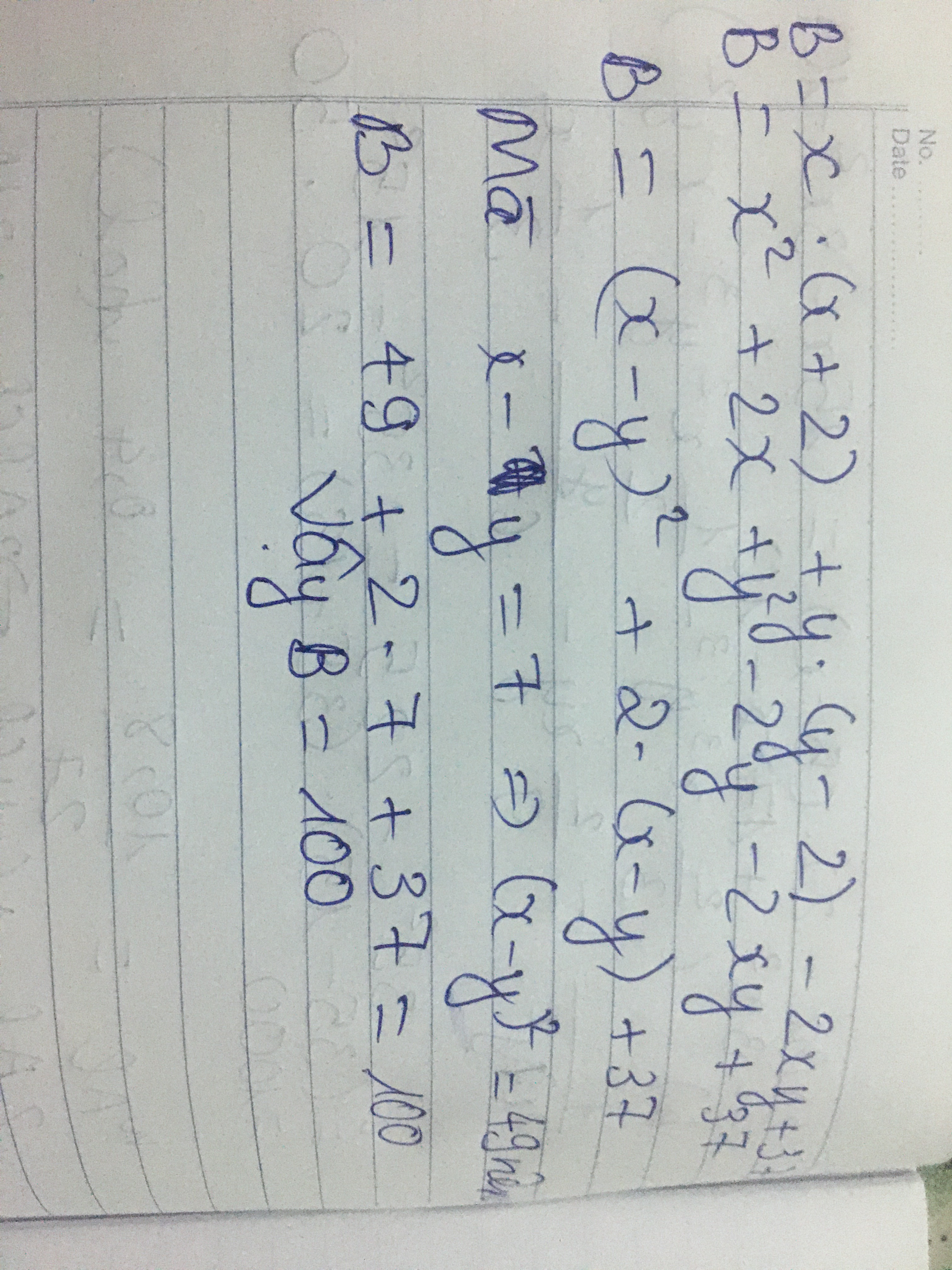 Cho x-y=7 . Tính giá trị của biểu thức B = x(x+2)+y(y-2)-2xy+37