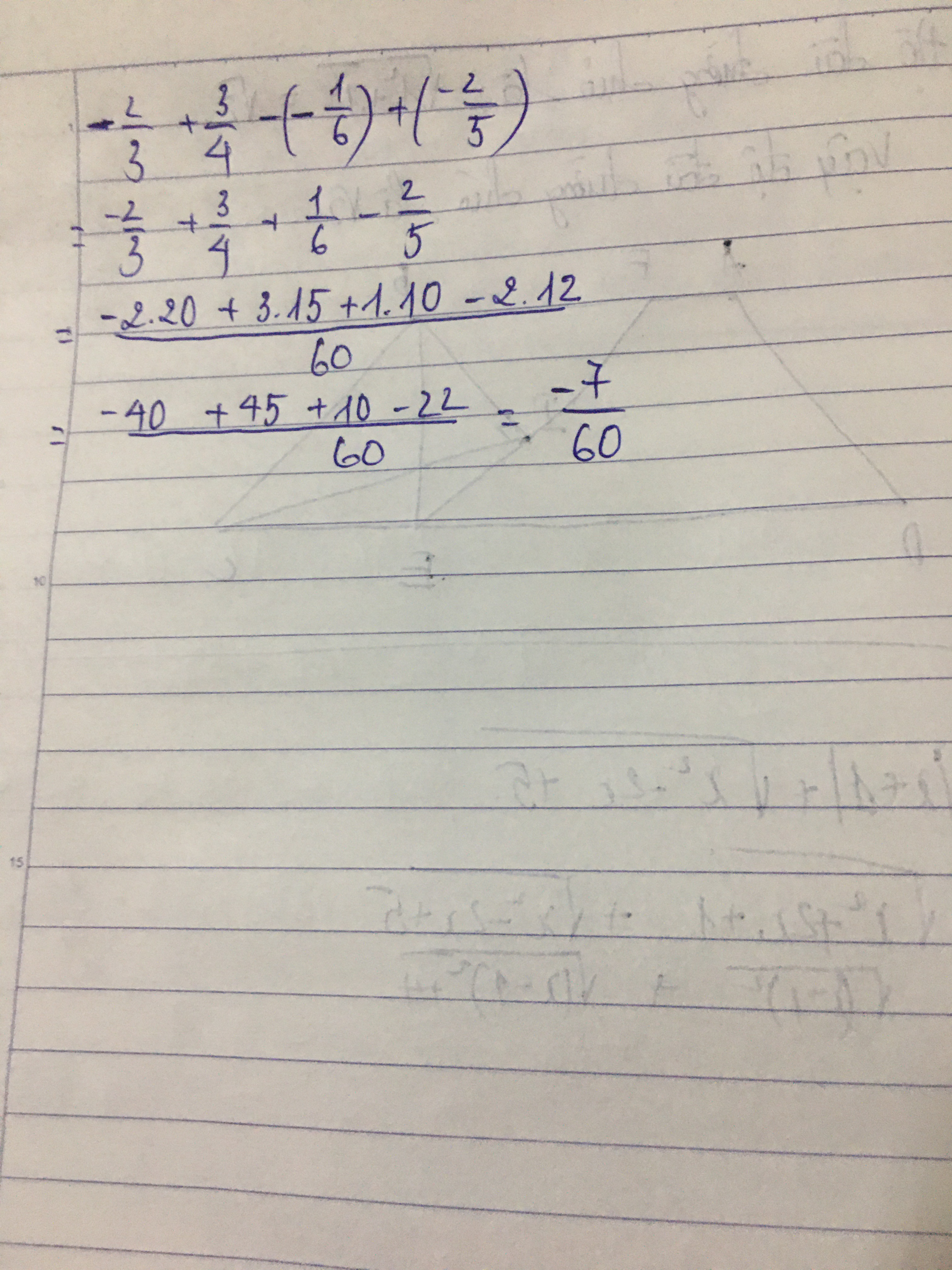 Tính : -2/3 + 3/4 - (-1/6) + (-2/5)
