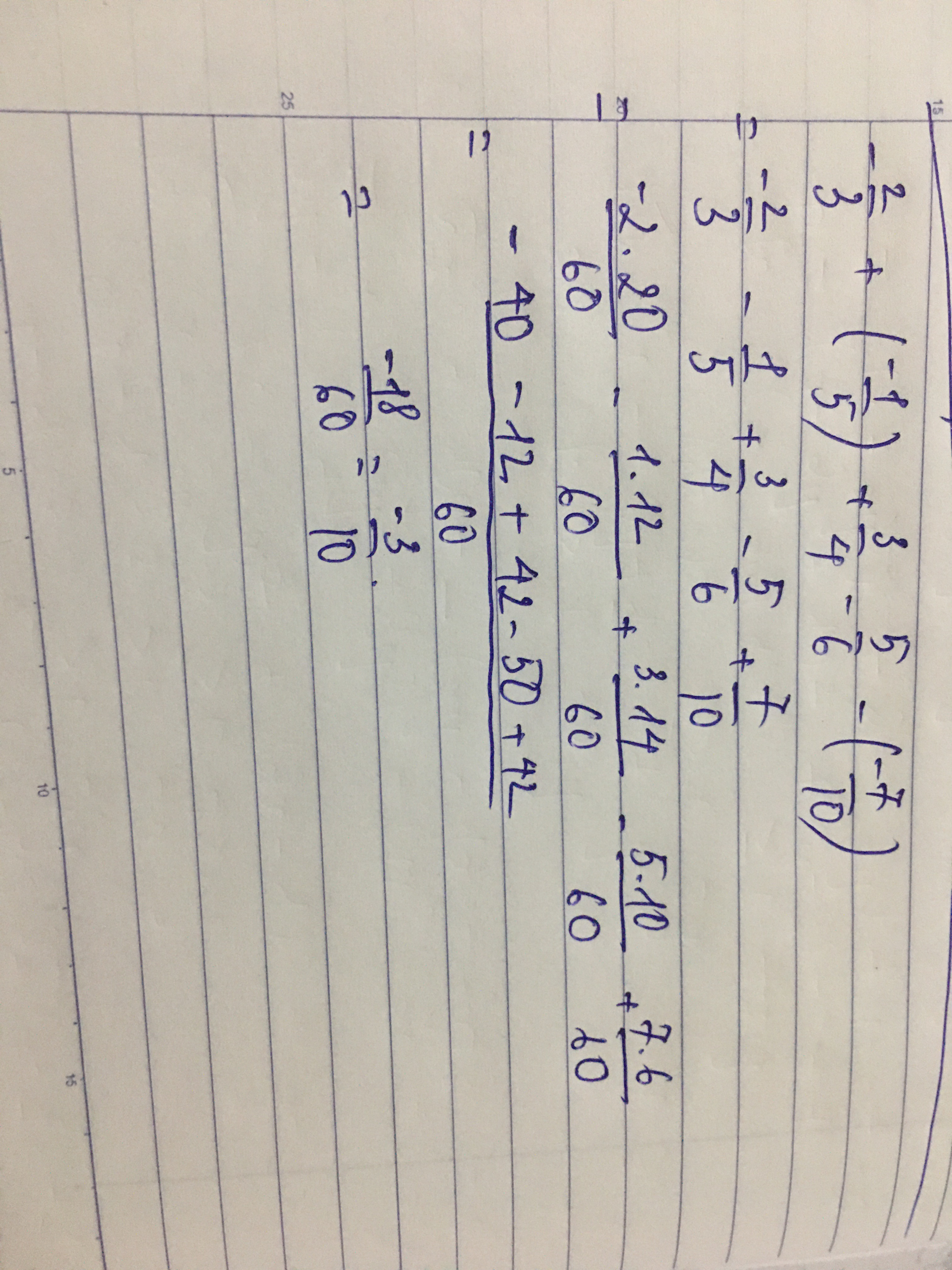 Tính : -2/3 + (-1/5) + 3/4 - 5/6 - (-7/10)