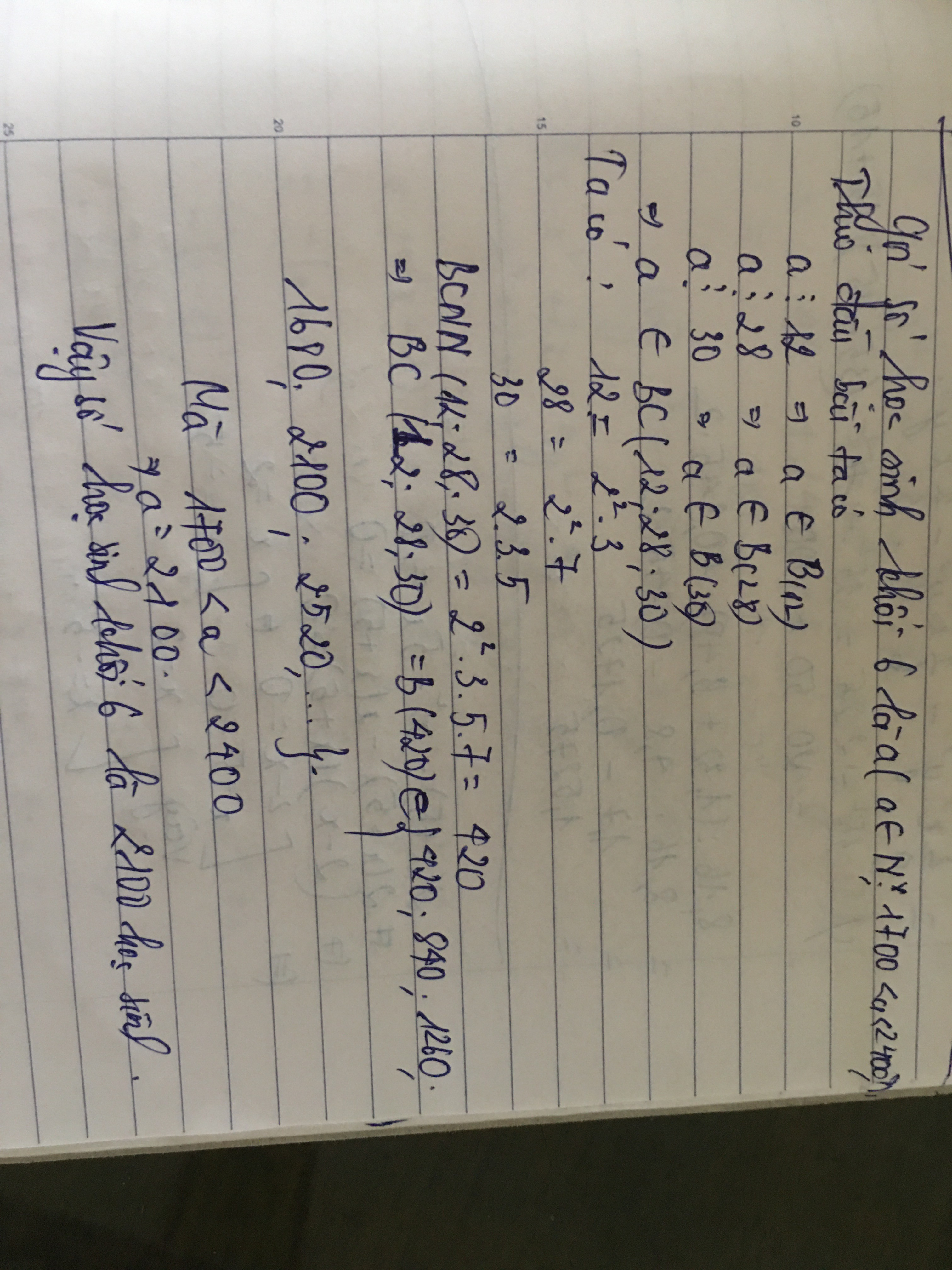 Số học sinh của một trường khi xếp hàng 12 hàng 28 hàng 30 để tập đồng diễn thể dục thì đều vừa đù.Biết số học sinh của trường khoảng từ 1700 đến 2400 em.Tính số học sinh của trường đó.