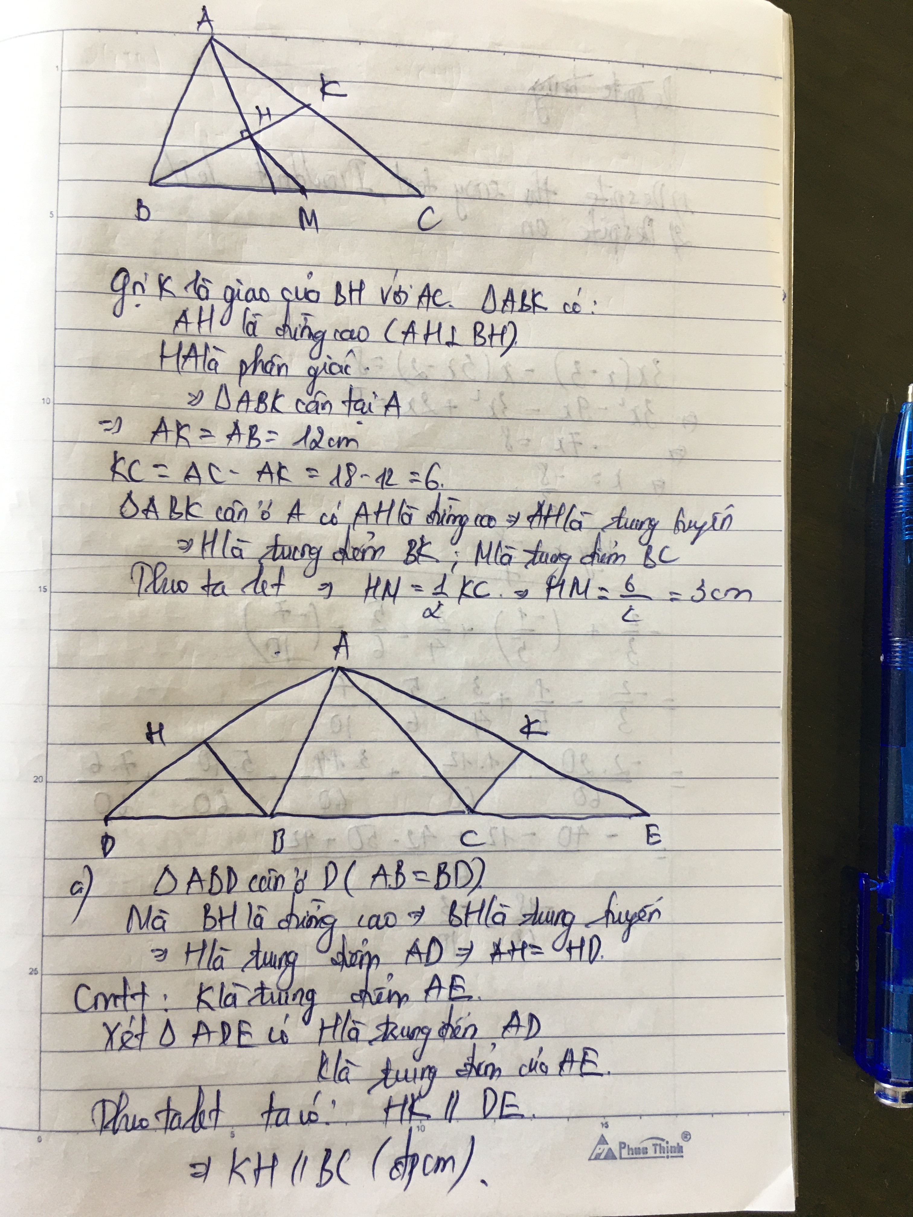 Bài 1. Cho tam giác ABC có AB=12cm, AC=18cm. Gọi H là chân đường vuông góc kẻ từ B đến tia phân giác của góc A. Gọi M là trung điểm của BC. Tính HM.