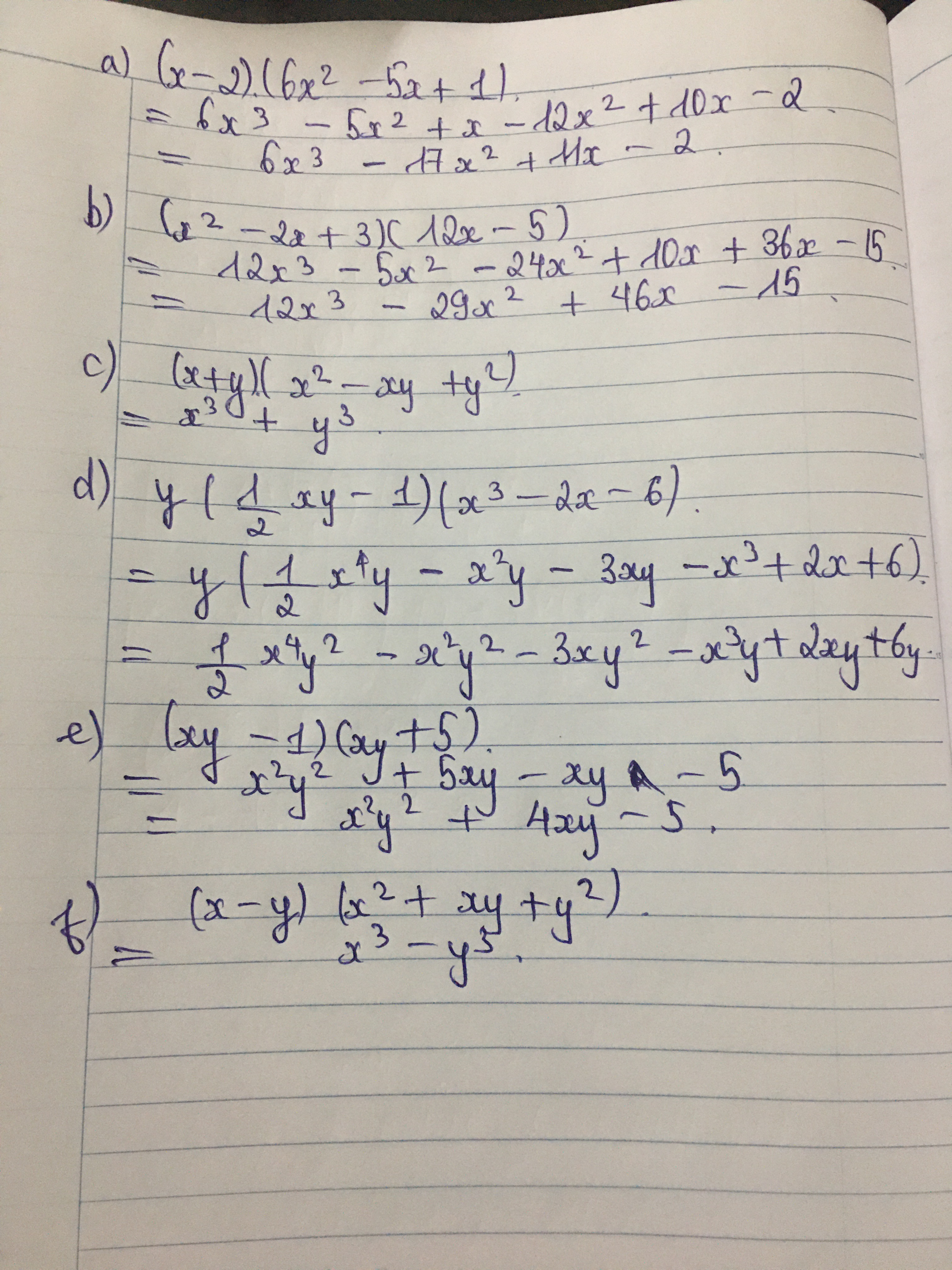 Bài 2. Làm tính nhân a) (x - 2)(6x ^ 2 - 5x + 1); c)(x^ 2 -2x+3)( 1 2 x-5) c) (x + y)(x ^ 2 - xy + y ^ 2) b Y(1/2 * x * y - 1) * (x ^ 3 - 2x - 6) d) (xy - 1)(xy + 5) 0 (x - y)(x ^ 2 + xy + y ^ 2)