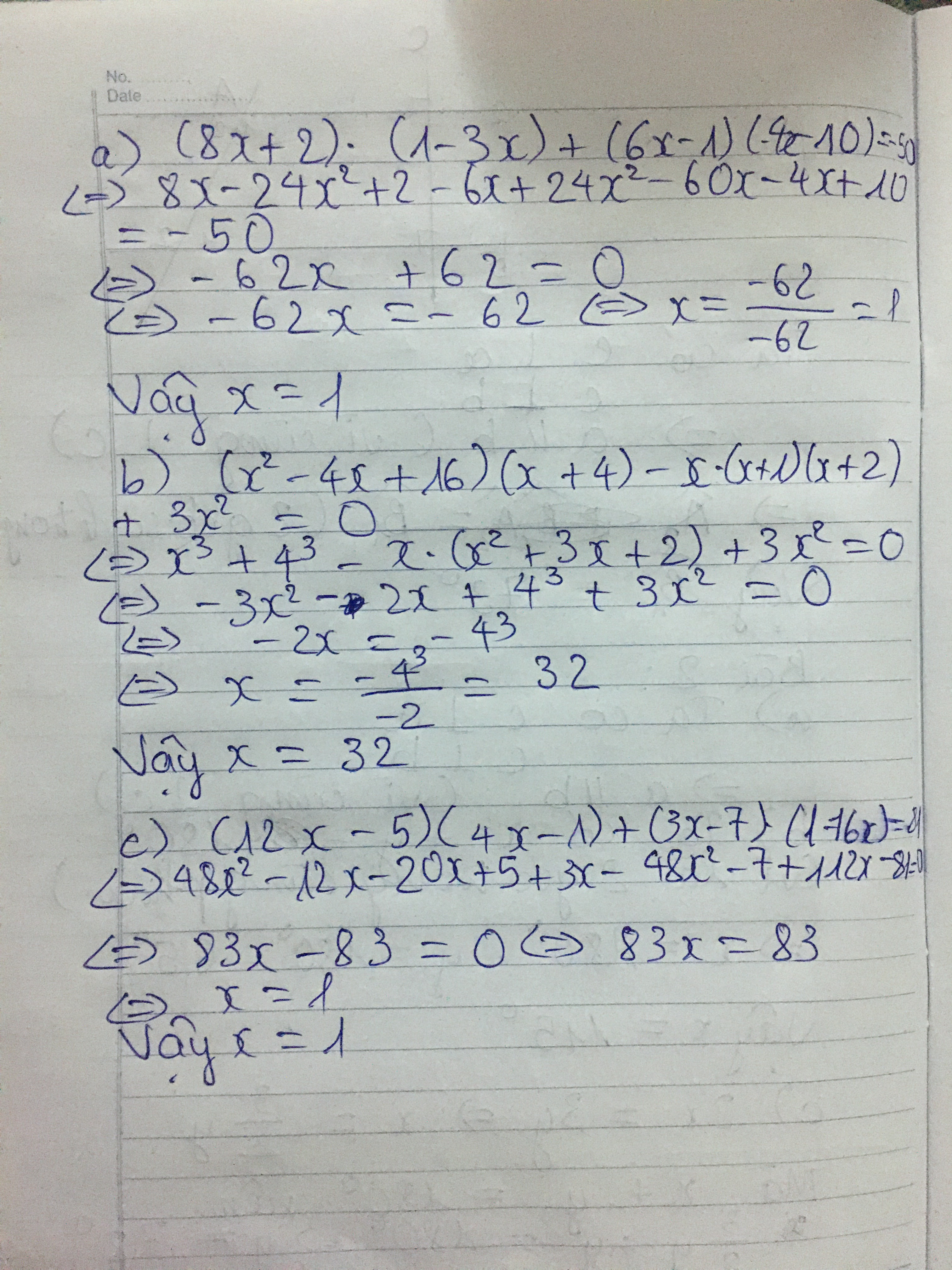 Bài 5. Tìm x, biếta) (8x + 2)(1 - 3x) + (6x - 1)(4x - 10) = - 50 b) (x ^ 2 - 4x + 16)(x + 4) - x(x + 1) * (x + 2) + 3x ^ 2 = 0 c) (12x - 5)(4x - 1) + (3x - 7)(1 - 16x) = 81