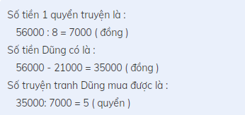 Hùng có 56 nghìn mua được 8 cuốn truyện tranh cùng loại, Dũng có ít hơn Hùng 21 nghìn, hỏi Dũng mua được bao nhiêu cuốn truyện tranh.