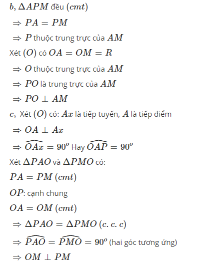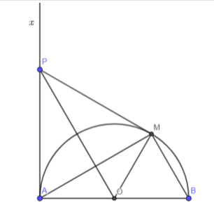 Cho nửa đường tròn tâm O , đường kính AB . Trên nửa đường tròn lấy điểm M sao cho góc MAB = 30 . Trên tia tiếp tuyến Ax của nửa đường tròn lấy điểm P sao cho AP=AM.