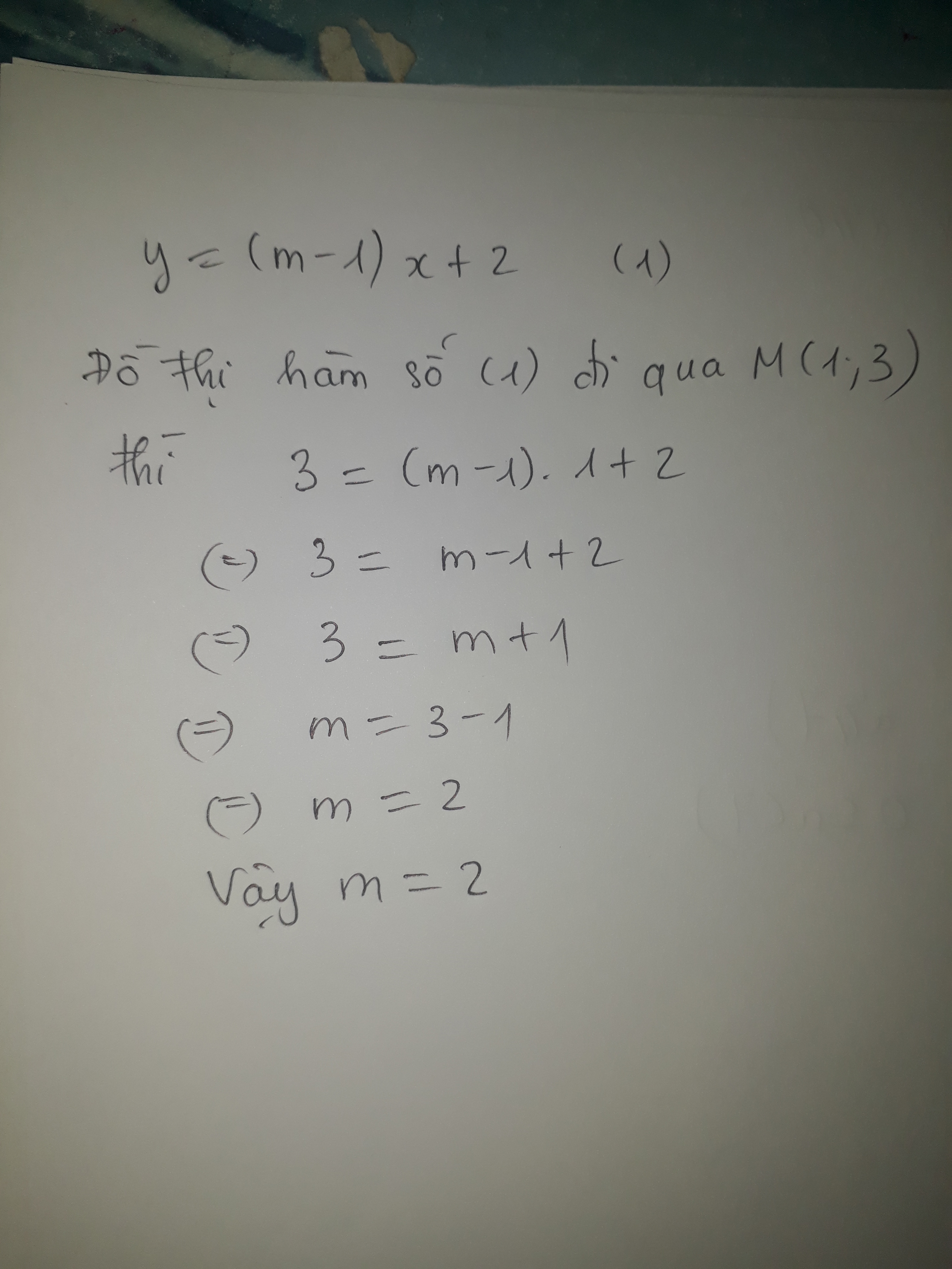 Câu 1: Cho hàm số y= (m-1)x+2. Tìm tham số m để đồ thị hàm số đi qua điểm
