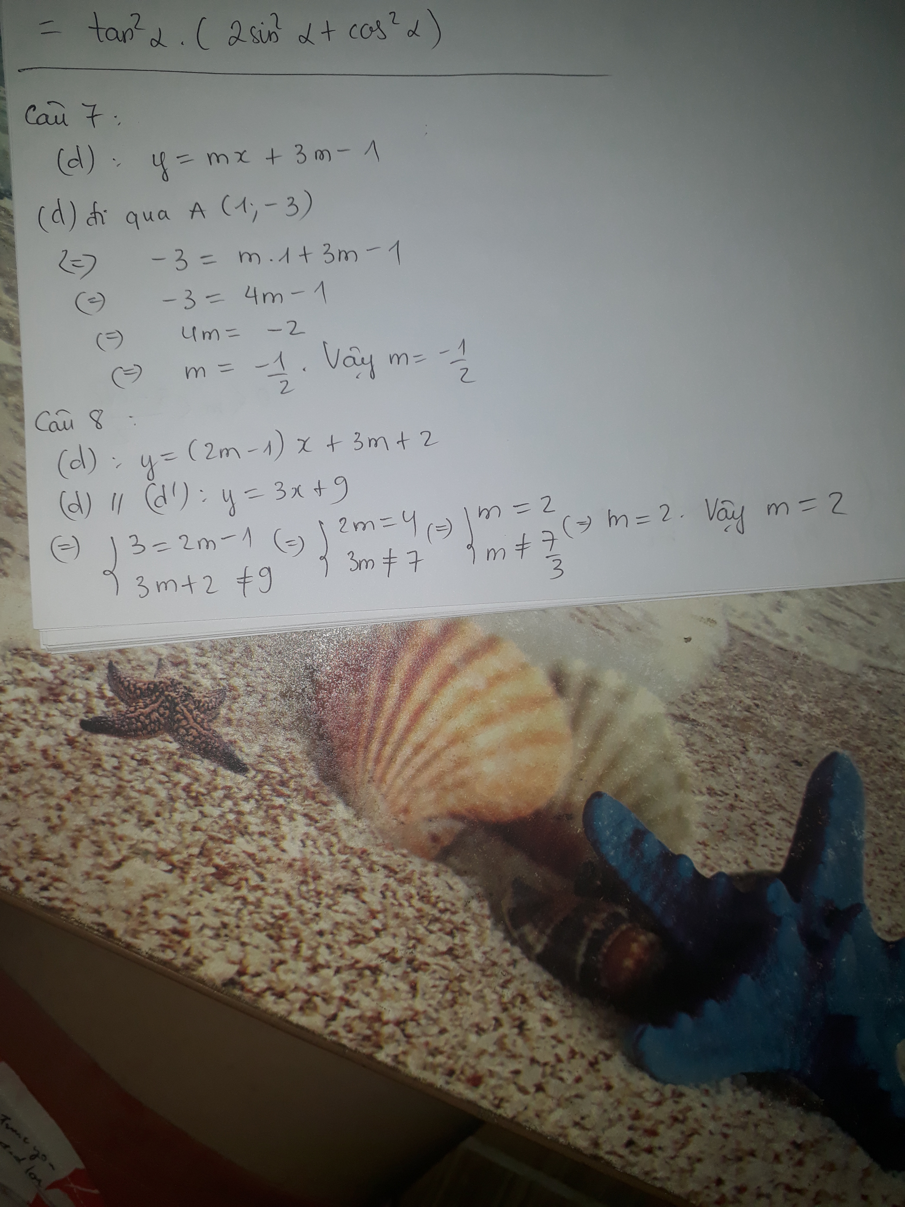 Câu 8: Xác định m để đường thẳng y=(2m-1)x+3m+2 song song với đường thẳng y=3x+9
