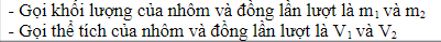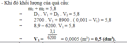 Một khối nhôm có thể tích và có khối lượng 5,8kg. Bên trong của khối nhôm này có khoảng rỗng và được trám kín bằng đồng. Cho biết khối lượng riêng của nhôm là , khối lượng riêng của đồng là . Tính thể tích phần được trám bằng đồng đó?