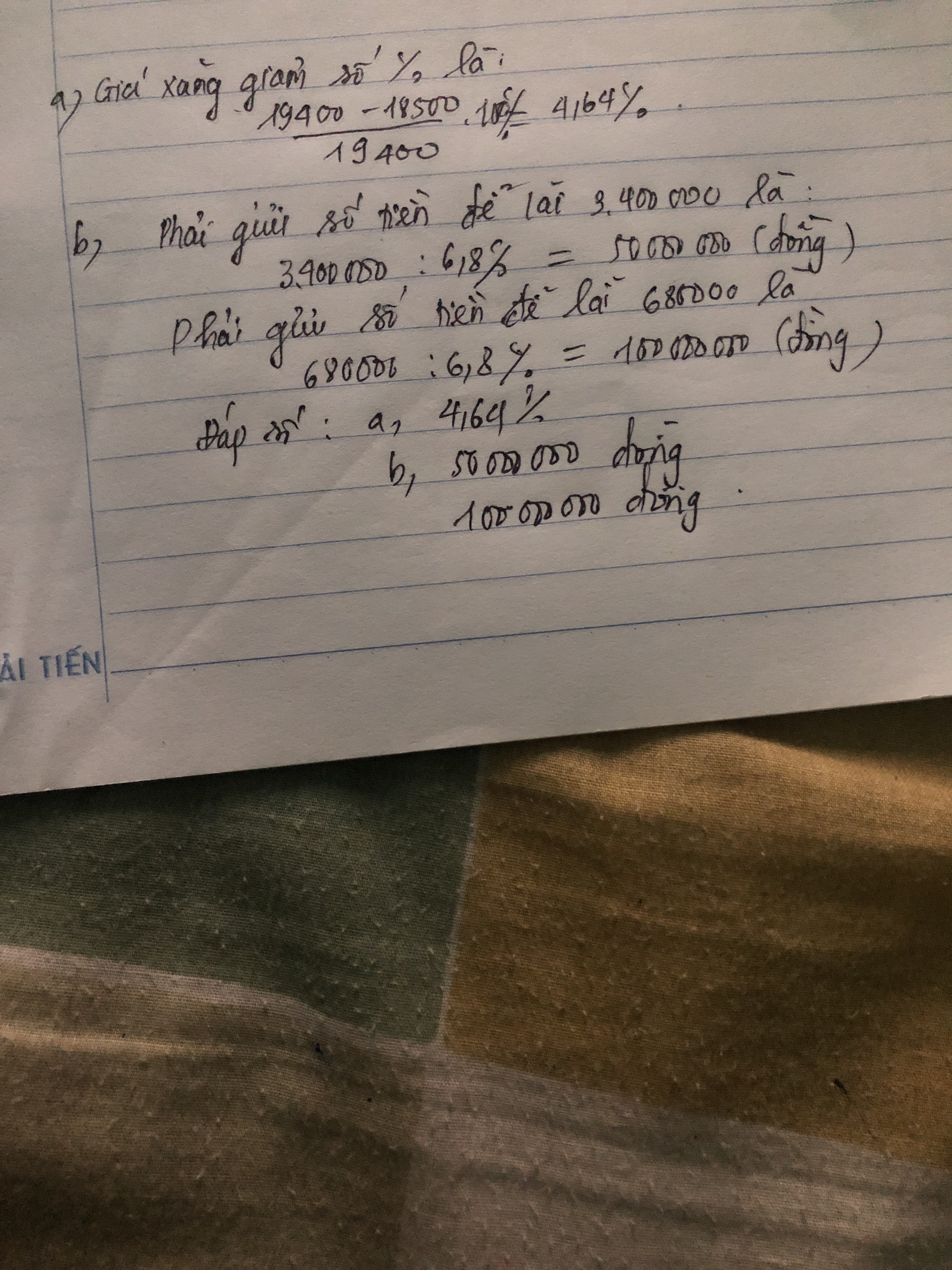 B) VỚI LÃI XUẤT TIẾT KIỆM 6,8% MỘT NĂM , EM TÍNH XEM PHẢI GỬI BAO NHIÊU TIỀN ĐỂ SAU MỘT NĂM NHẬN ĐƯỢC SỐ TIỀN LÃI LÀ 3.400.000 ĐỒNG ; 6.800.000 ĐỒNG