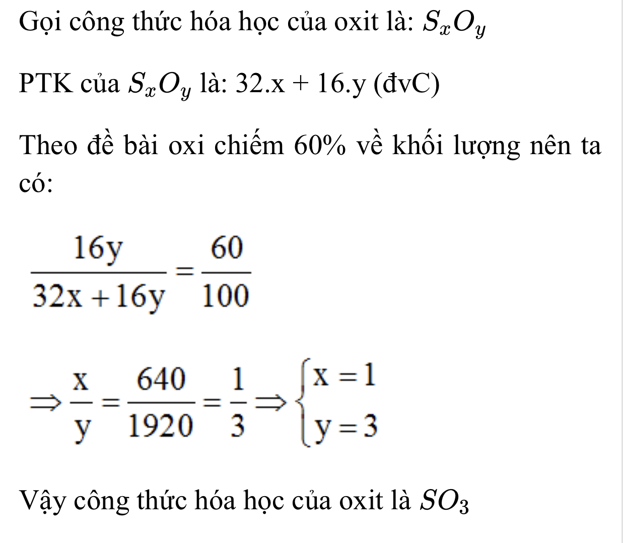 Một ôxit của lưu huỳnh trong đó ôxi chiếm 60% về khối lượng. Tính công thức phân tử của ôxit đó. Cho em hỏi đây là dạng bài tập gì ạ