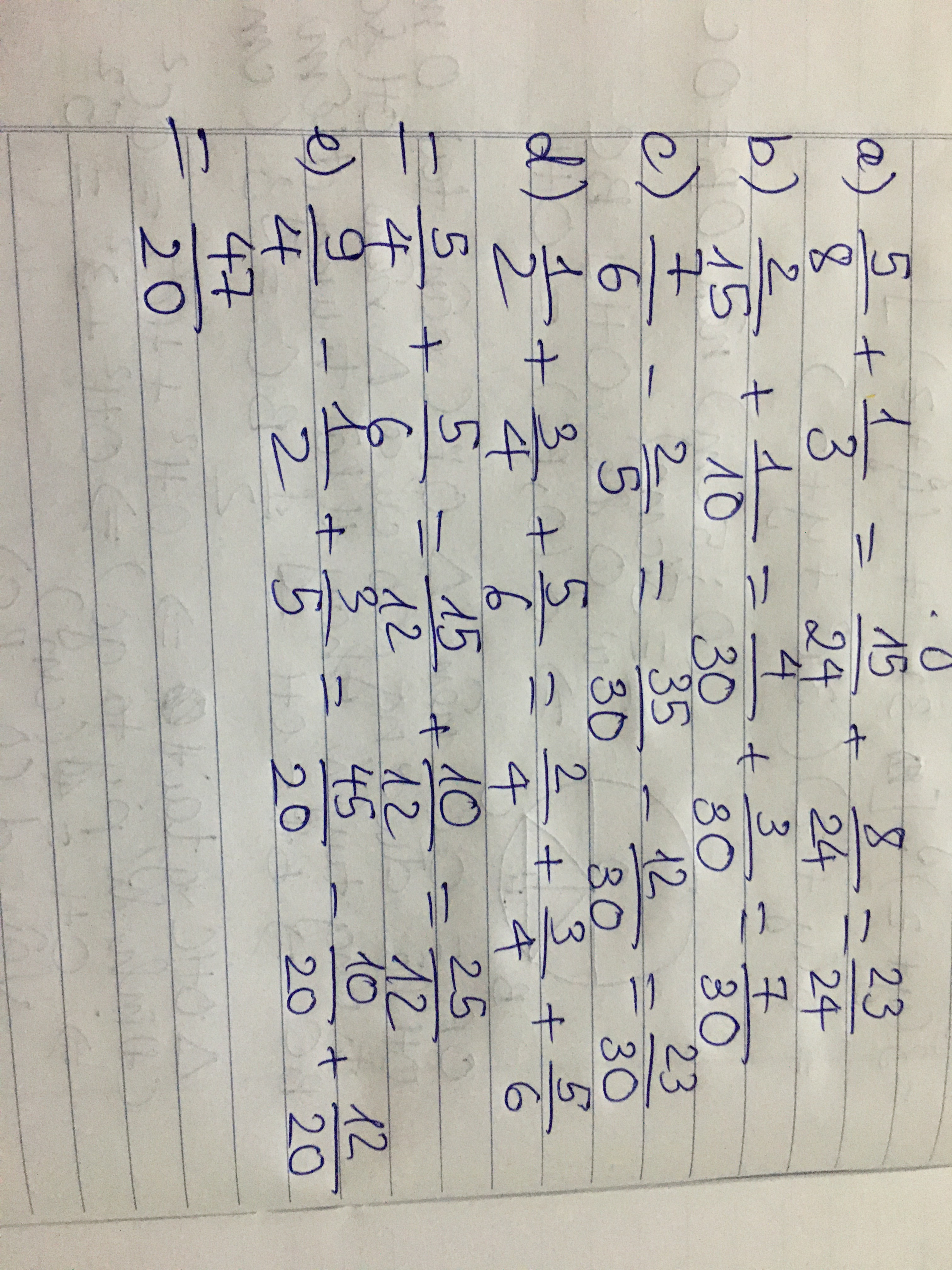Tính a 5\8 +1\3 b 2\15 + 1\10 c 7\6 - 2\5 d 1\2 +3\4 +5\6 e 9\4 -1\2 +3\5