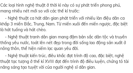 - Nghệ thuật kiến trúc, điêu khắc đạt trình độ cao, đặc biệt, nghệ thuật tạc tượng ở thế kỉ XVIII đạt đến trình độ điêu luyện, chứng tỏ tài năng sáng tạo tuyệt vời của người nghệ sĩ dân gian.