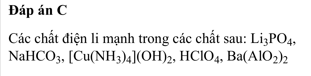 Bài 3 Số chất điện li mạnh trong các chất sau: Li3PO4, Urê, HF, NH3, NaHCO3, [Cu(NH3)4](OH)2, HClO4, Ba(AlO2)2: