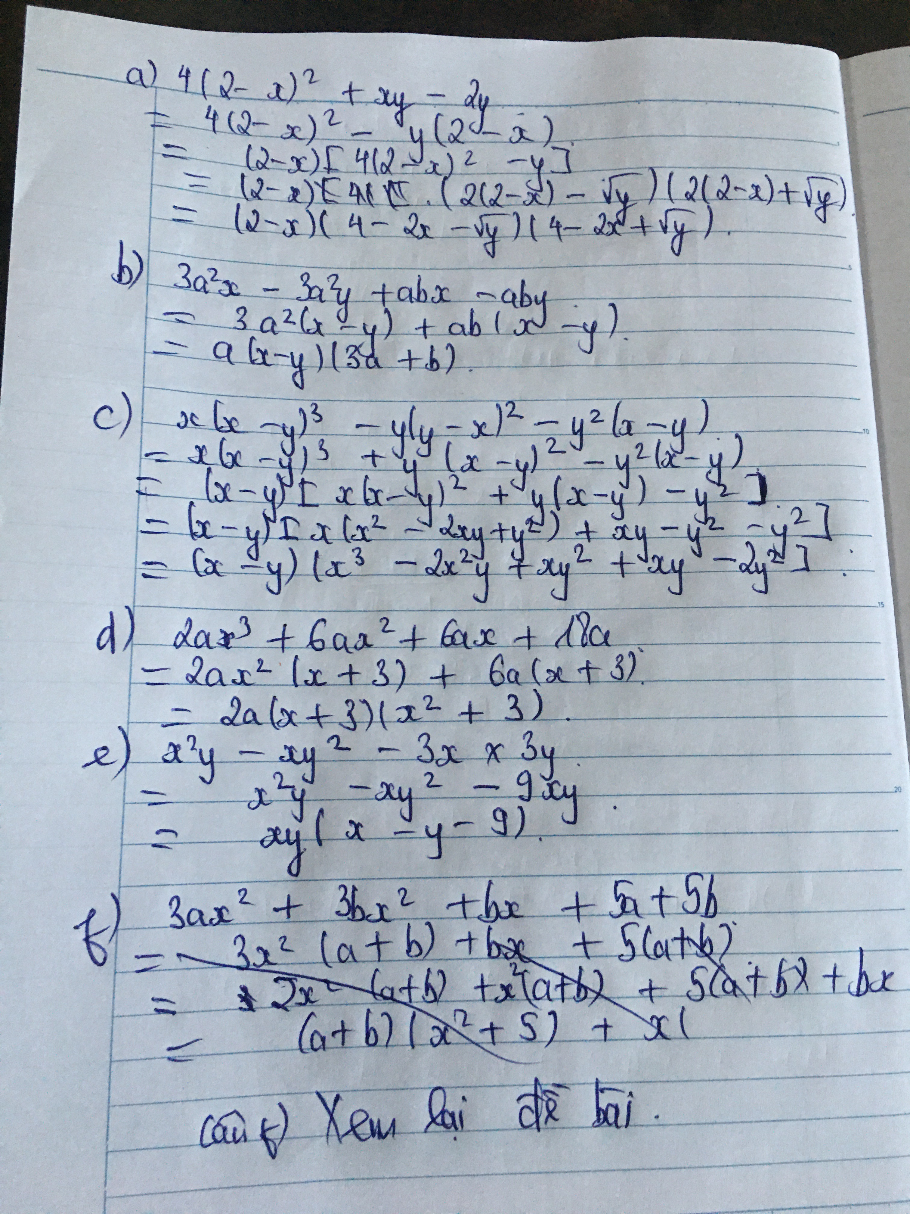 Phâm tích đa thức thành nhân tử a)4(2-x)²+xy-2y b)3a²x-3a²y+abx-aby c)x(x-y)³-y(y-x)²-y²(x-y) d)2ax³+6ax²+6ax+18a e)x²y-xy²-3x×3y f)3ax²+3bx²+bx+5a+5b