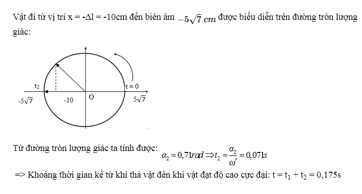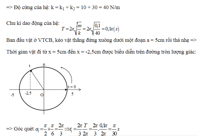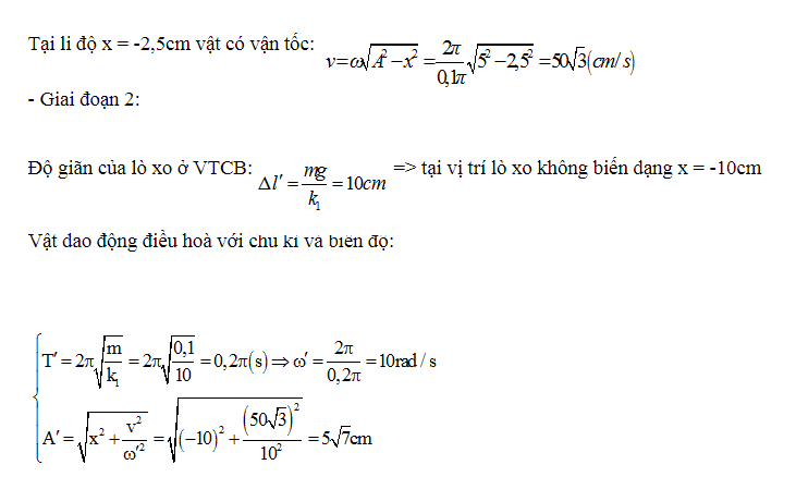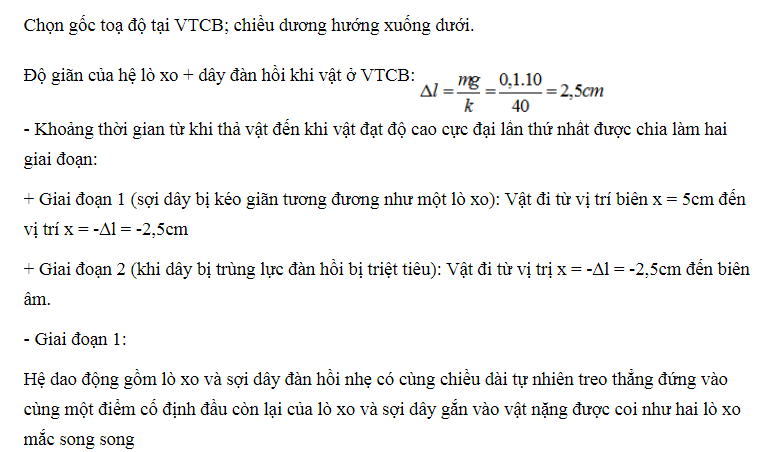 Câu 20. Một lò xo và một sợi dây đàn hồi nhẹ có cùng chiều dài tự nhiên được treo thẳng đứng vào cùng một điểm cố định, đầu còn lại của lò xo và sợi dây gắn vào vật nặng có khối lượng m = 100 g như hình vẽ. Lò xo có độ cứng k1 = 10 N/m, sợi dây khi bị kéo dãn xuất hiện lực đàn hồi có độ lớn tỷ lệ với độ giãn của sợi dây với hệ số đàn hồi k2 = 30 N/m (sợi dây khi bị kéo dãn tương đương như một lò xo, khi dây bị cùng lực đàn hồi triệt tiêu) Ban đầu vật đang ở vị trí cân bằng, kéo vật thẳng đứng xuống dưới một đoạn a = 5 cm rồi thả nhẹ. Khoảng thời gian kể từ khi thả cho đến khi vật đạt độ cao cực đại lần thứ nhất xấp xỉ bằng