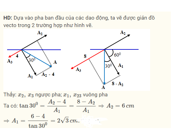 Một vật thực hiện đồng thời 3 dao động điều hòa cùng phương, cùng tần số có các phương trình sau: x1 = A1cos(5πt – π/3) (cm), x2 = A2cos(5πt + π/6) (cm), x3 = A3cos(5πt - 5π/6) (cm) thì dao động tổng hợp có phương trình là x = Acos(5πt + φ) (cm). Khi thay đổi để biên độ A3 = 4 cm hoặc A3 = 8 cm thì thấy tương ứng với đó là φ = - π/6 và φ = - π/2. Tính biên độ A1.