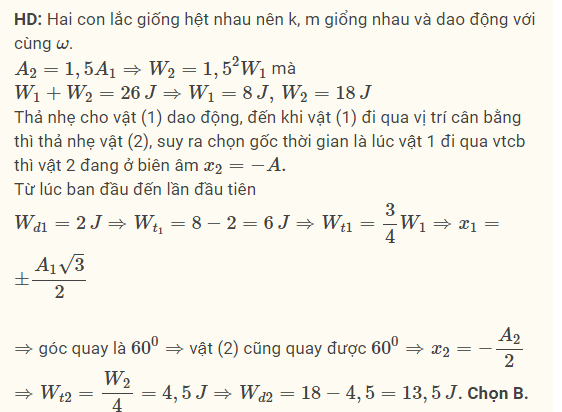 Hai hệ dao động con lắc lò xo (1) và (2) giống hệt nhau cùng dao động theo phương ngang trên hai đường thẳng song song. Ban đầu đưa 2 vật đến vị trí mà 2 lò xo nén một đoạn lần lượt là A1 và A2. Biết A2 = 1,5A1. Thả nhẹ cho vật (1) dao động, đến khi vật (1) đi qua vị trí cân bằng thì thả nhẹ vật (2). Tổng cơ năng của 2 vật là 26 J. Khi động năng của vật (1) là 2 J thì động năng của vật 2 là