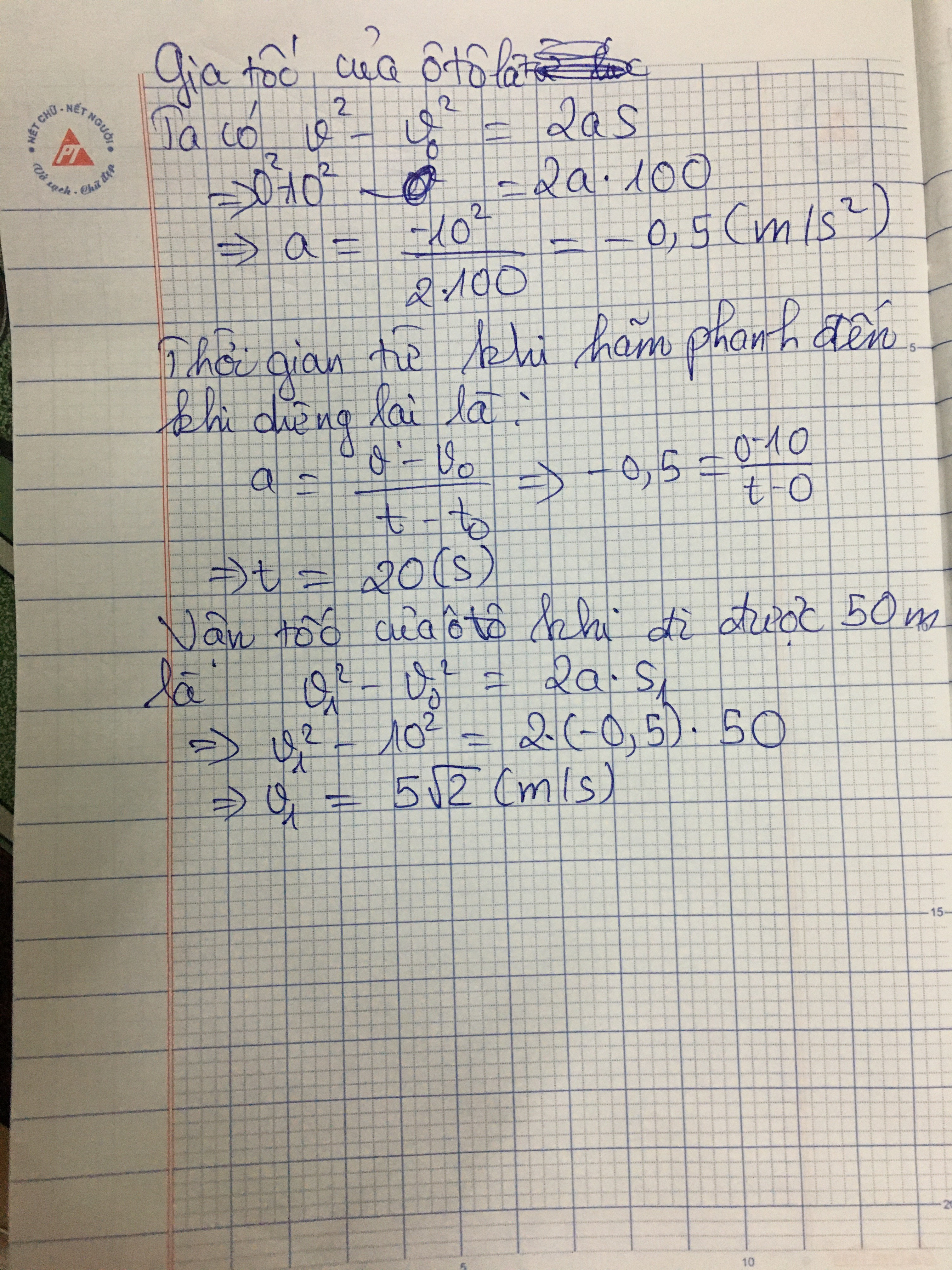 Khi ô tô đang chạy với vận tốc 10m/s trên đoạn đường thẳng thì người lái xe hãm phanh và ô tô chuyển động chậm dần đều. Cho tới khi dừng hẳn lại thì ô tô đã chạy thêm được 100m. Gia tốc của ô tô là, Tính thời gian từ lúc hãm phanh cho đến khi ô tô dừng lại, Tính vận tốc của ô tô khi đi được quãng đường 50m