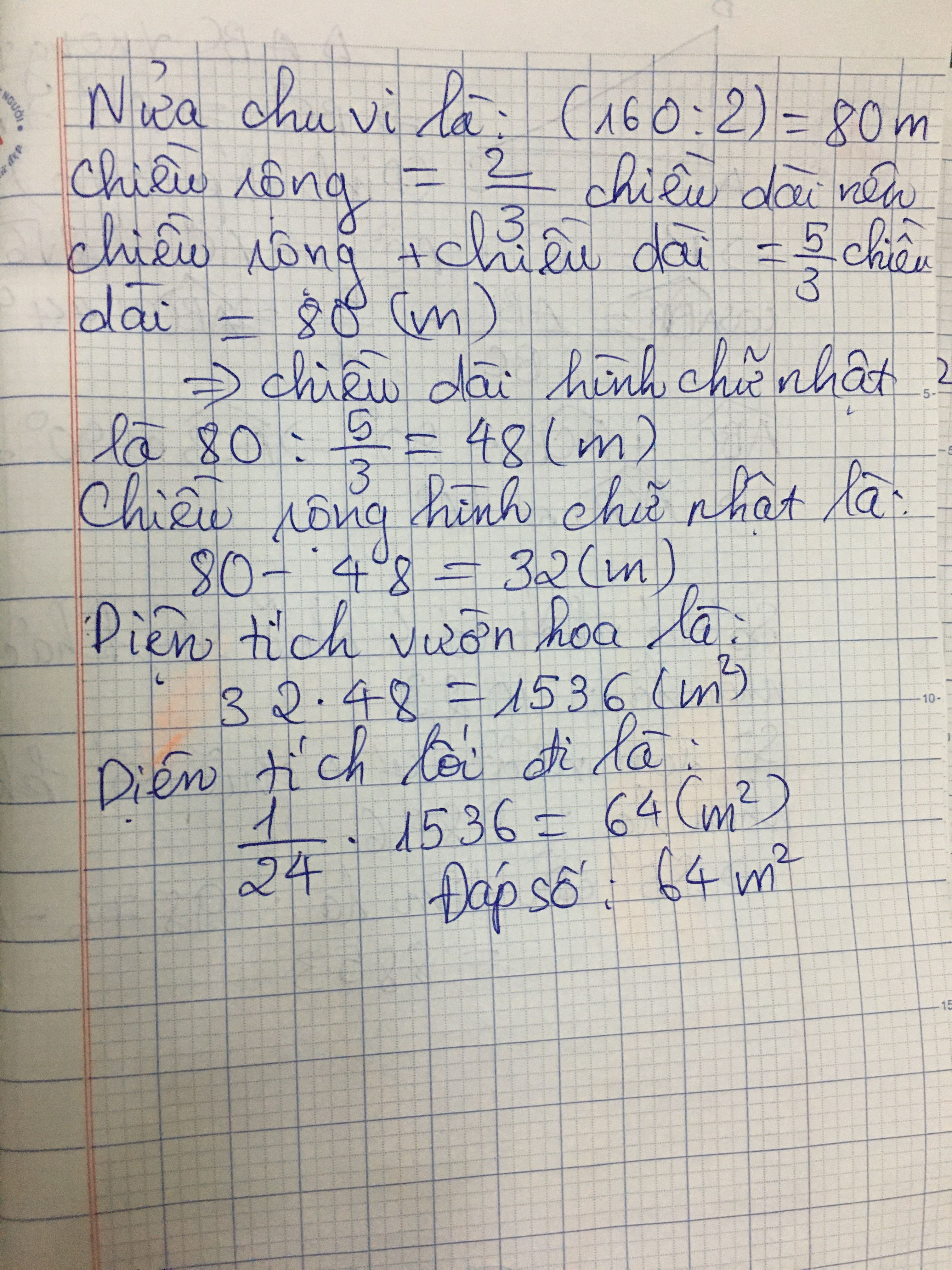 Vườn hoa của nhà trường là hình chữ nhật chu vi 160 m và chiều rộng bằng 2/3 chiều dài a Tính chiều dài chiều rộng của vườn hoa đó chấm người ta để lại 1/24 diện tích vườn hoa làm lối đi Hỏi diện tích lối đi bằng bao nhiêu mét vuông