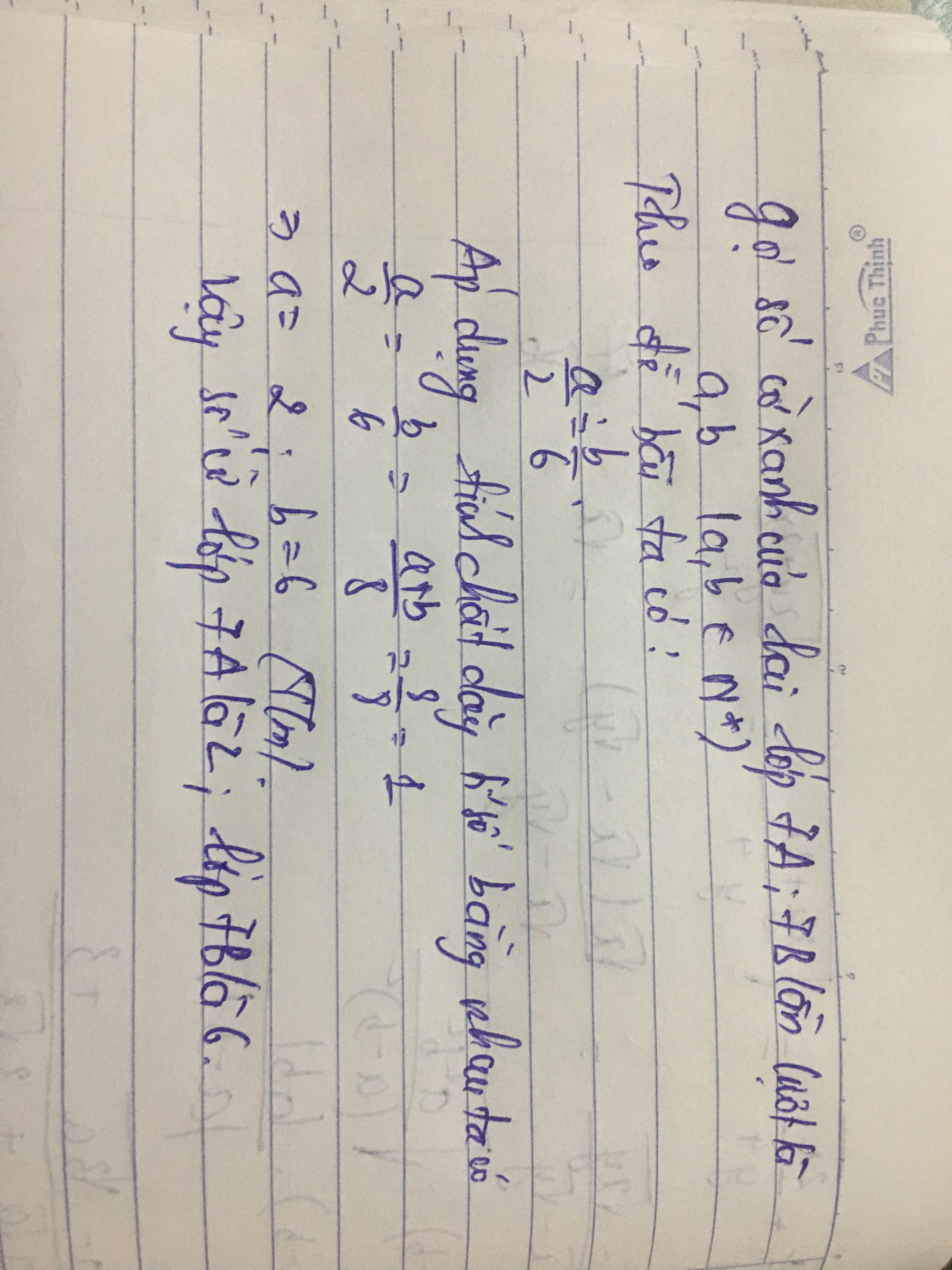 Số cờ xanh của lớp 7A và lớp 7B tỉ lệ với 2 và 6 tính số cờ xanh của mỗi lớp, biết tổng số cờ xanh của hai lớp nhận được là 8 . Giúp mình với ạ mình cảm ơn