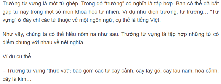 Trường từ vựng là gì cho vd và chỉ ra trường từ vựng đó? Giúp mình với ạ mình cảm ơn