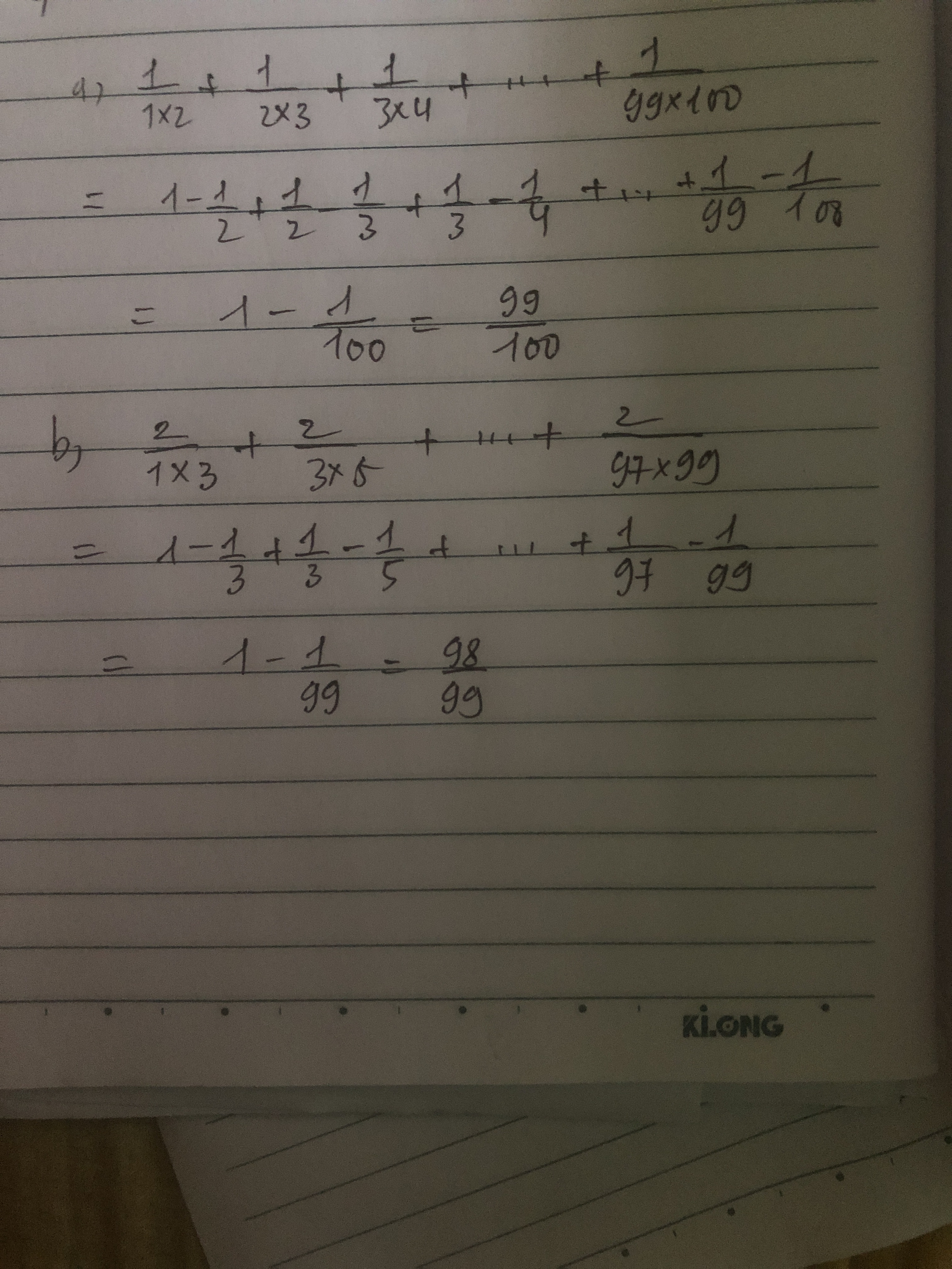 Tính nhanh: a) 1/1×2+ 1/2×3+ 1/3×4+.........+ 1/99×100