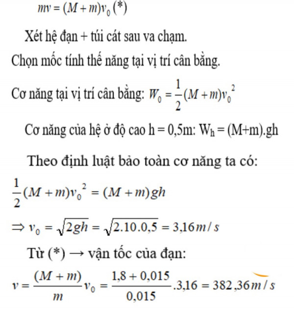 Bắn một viên đạn có khối lượng với vận tốc cần xác định vào một túi cát được treo nằm yên có khối lượng , đạn mắc lại trong túi cát và chuyển động cùng với tụi cát. Sau va chạm, túi cát được nâng lên đến độ cao 0,5m so với vị trí cân bằng ban đầu. Hãy tìm vận tốc của đạn (túi cát được coi là con lắc thử đạn vì nó cho phép xác định vận tốc của đạn).